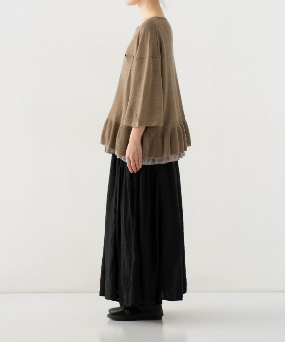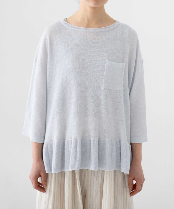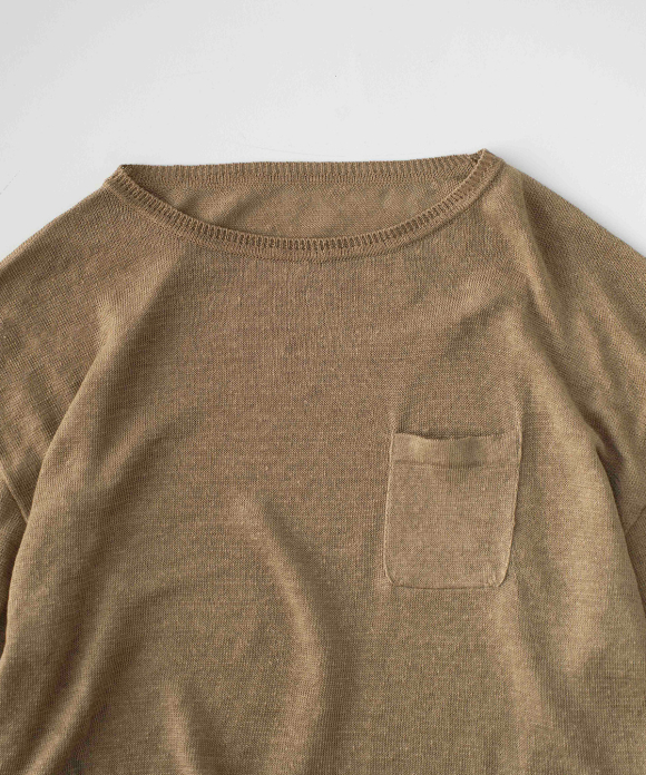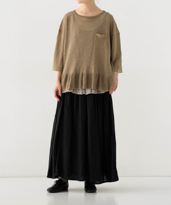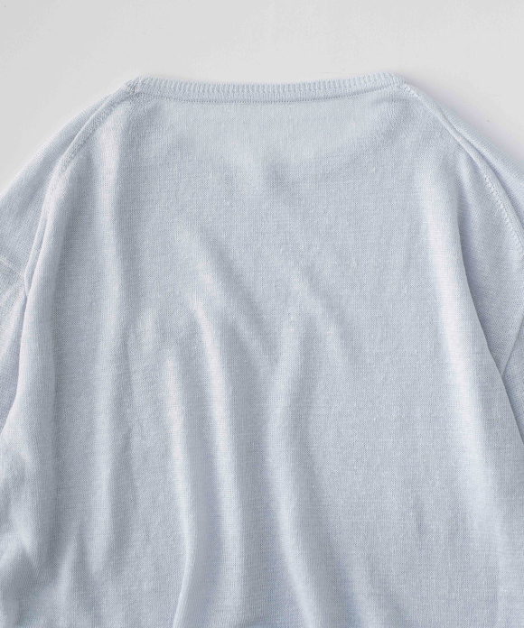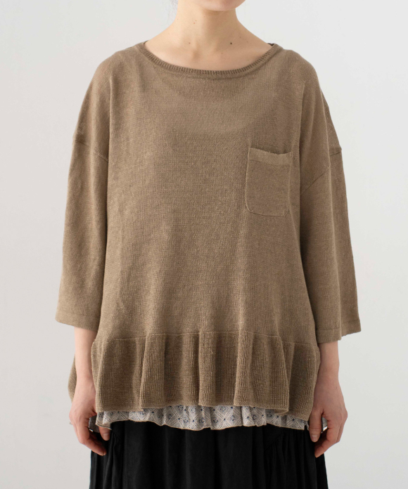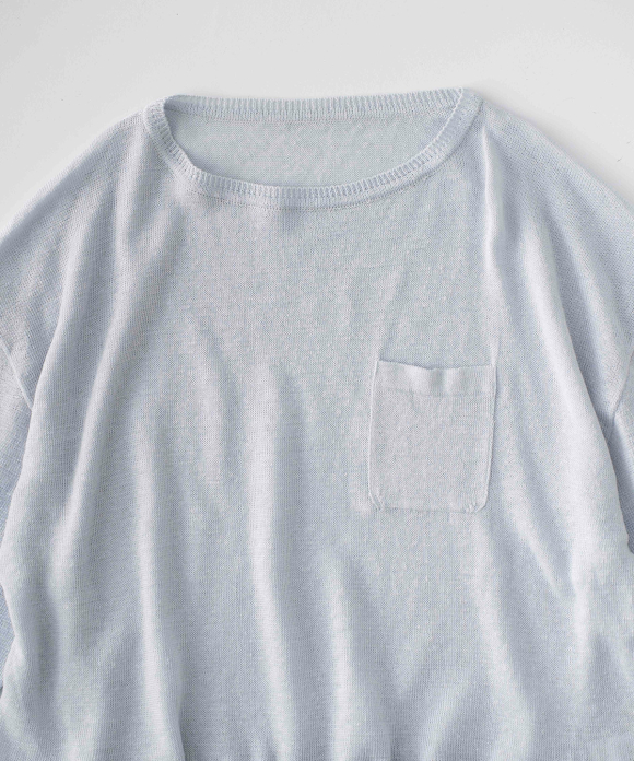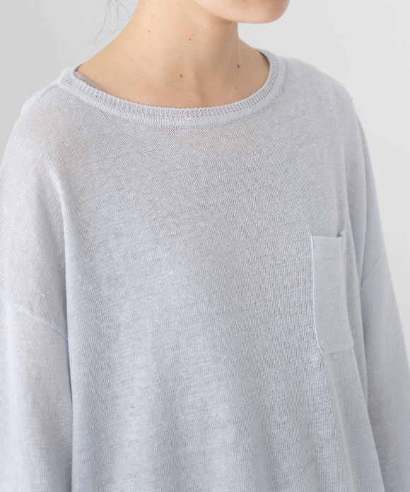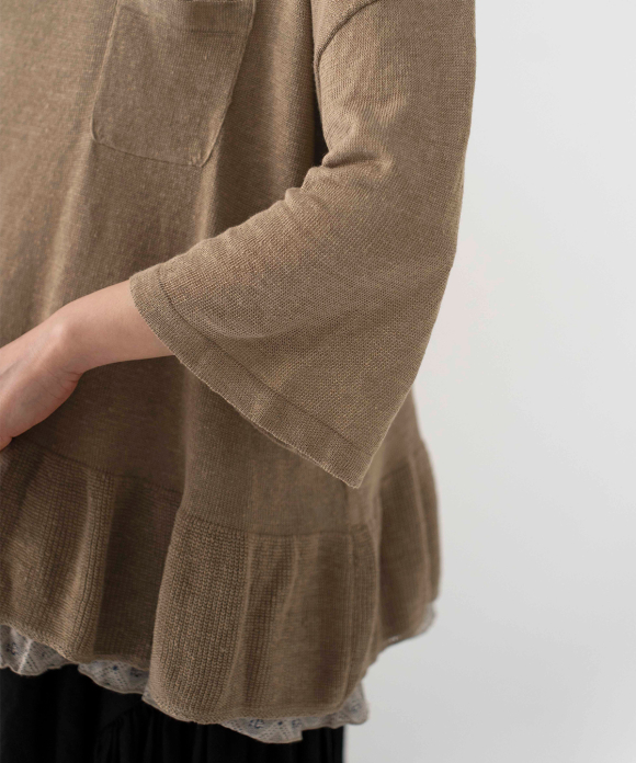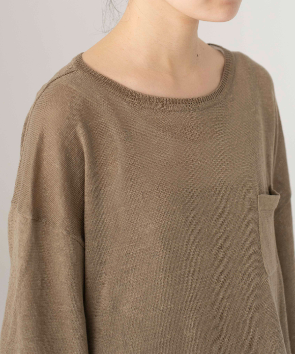 The hem is flared through the knitting process, creating a flowing silhouette. A pocket on the chest adds a touch of understated sweetness. The elbow-length hem provides reassuring coverage, subtly concealing the arms. The slightly boat-neck style neckline creates a clean and neat impression. Enjoy the breathability and natural texture unique to linen. It's also machine washable, making it a convenient piece for everyday wear.