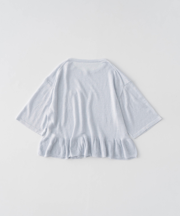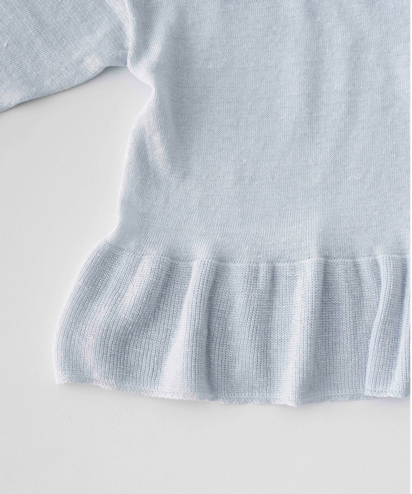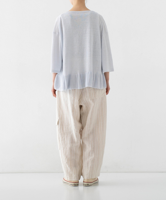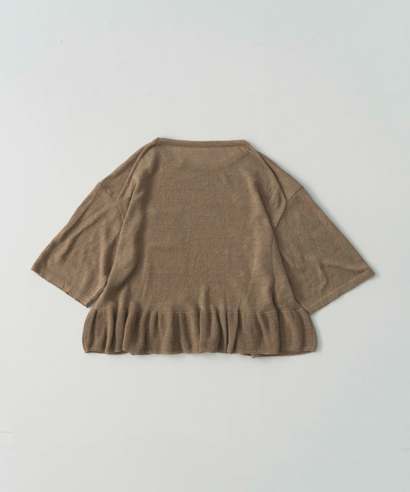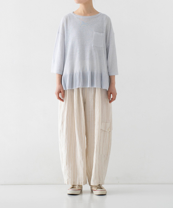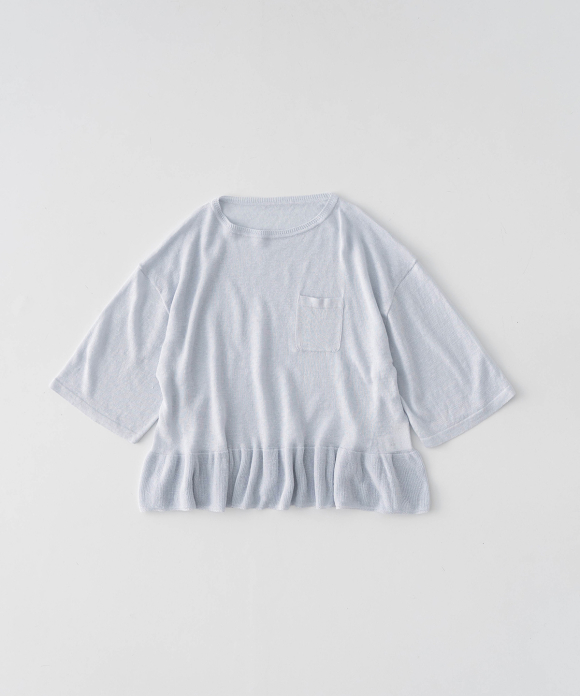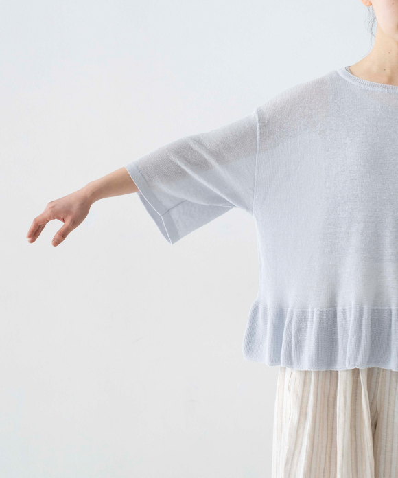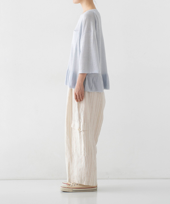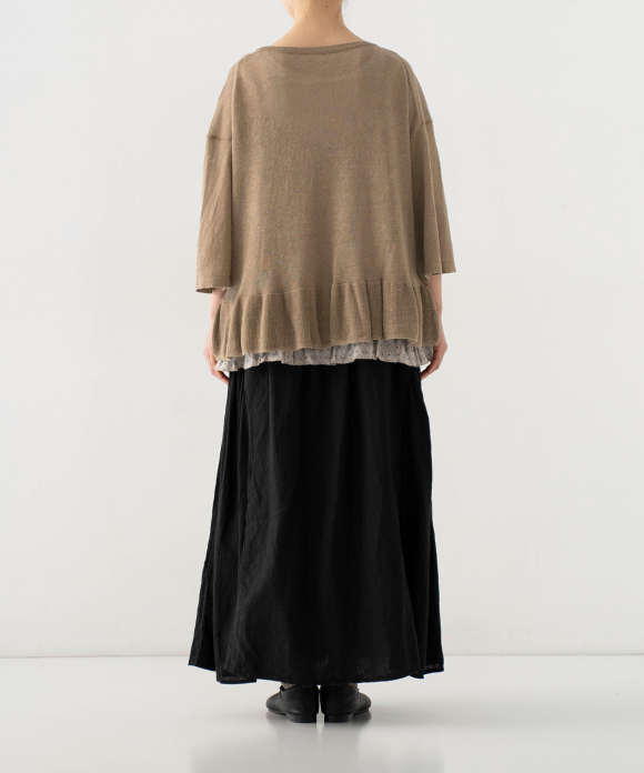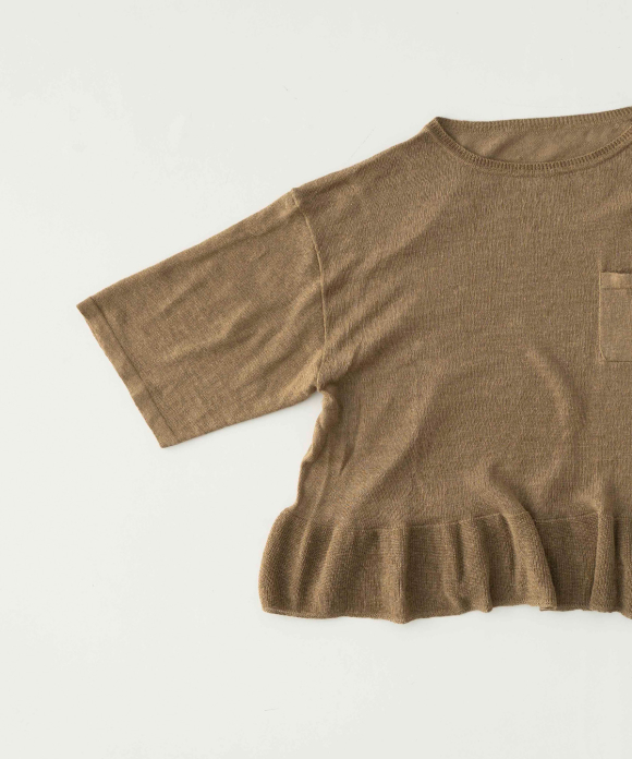 The hem is flared through the knitting process, creating a flowing silhouette. A pocket on the chest adds a touch of understated sweetness. The elbow-length hem provides reassuring coverage, subtly concealing the arms. The slightly boat-neck style neckline creates a clean and neat impression. Enjoy the breathability and natural texture unique to linen. It's also machine washable, making it a convenient piece for everyday wear.