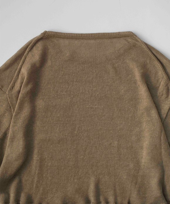 This fabric uses 100% linen yarn made from European linen raw materials. The spinning is done in China, the twisting is done in Aichi Prefecture, and the dyeing is done in Gosen City, Niigata Prefecture, resulting in a high-quality material carefully finished in Japan. It is characterized by its luster, firmness, and beautiful color development. By blending multiple European linen raw materials, it has fewer knots and a smooth, elegant finish. Linen is inherently prone to knots and difficult to knit, but we take the time and effort to knit it carefully by slowing down the knitting machine speed and applying a special linen wax to the yarn to improve its smoothness.