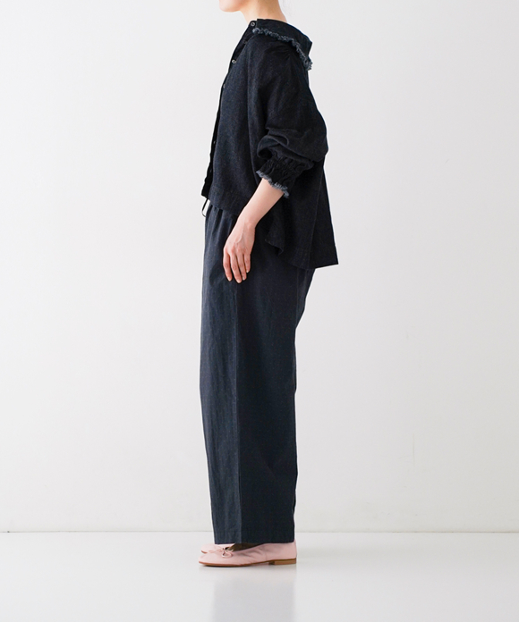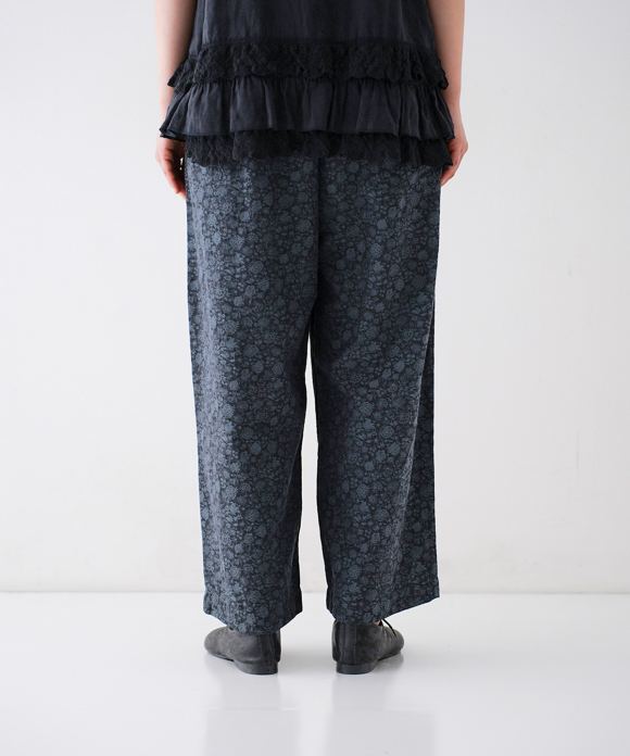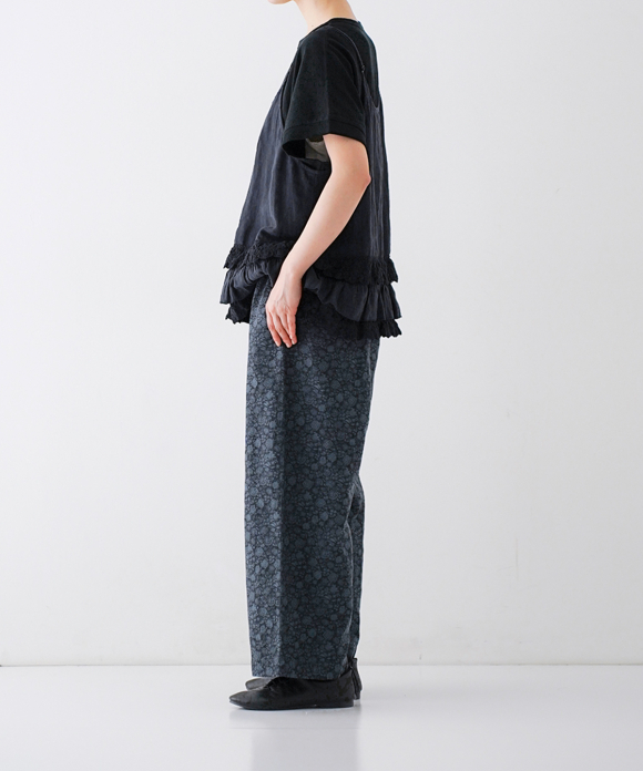 The yarn used for this fabric is made from organic cotton sourced from India. While spinning is carried out locally in India, all subsequent processes—including weaving, yarn dyeing, and finishing—are done in Nishiwaki City, Hyogo Prefecture. The floral fabric is woven in a twill structure, while the dot pattern is plain weave. Due to this difference in weave structures, the floral fabric has a softer hand feel, whereas the dot fabric has a firmer texture. Additionally, the fabric is treated with an advanced water-repellent finish known as the “Lotus Over” process, which repels water like the surface of a lotus leaf. This treatment also resists oil and helps prevent staining, making the fabric suitable for various conditions. These easy pants are designed to highlight the jacquard pattern. Thanks to the water-repellent finish, they are practical even on rainy days. The waist features an elastic band and drawstring for an adjustable and relaxed fit. The hips offer a generous cut to comfortably cover the body, while the straight silhouette tapers slightly toward the hem for a clean, balanced look.