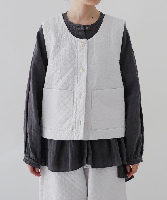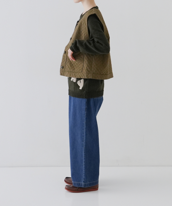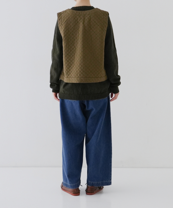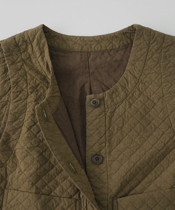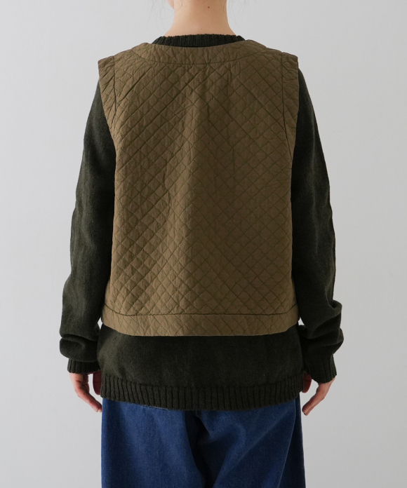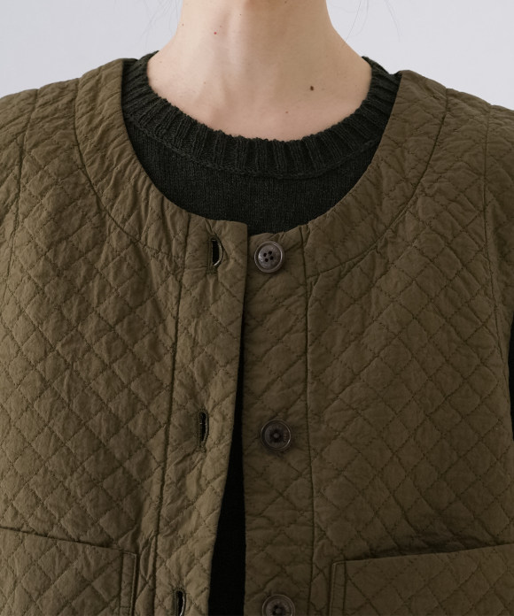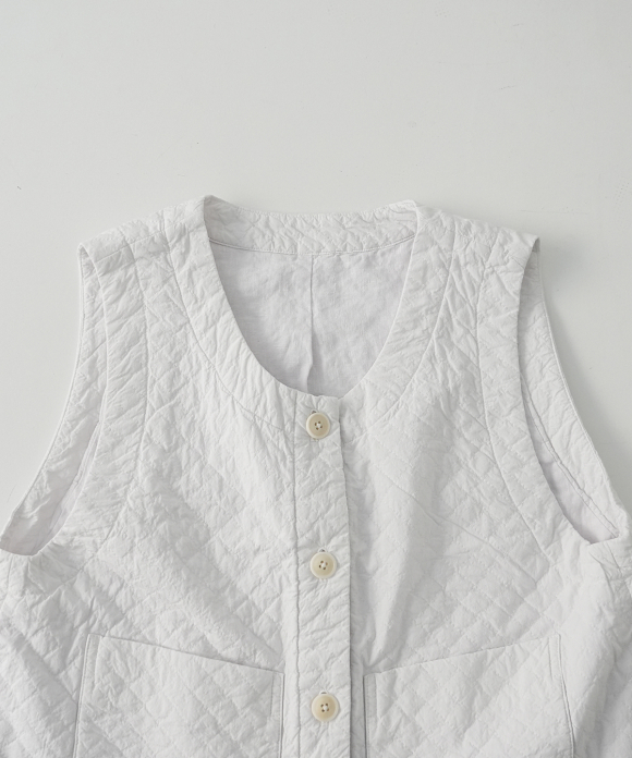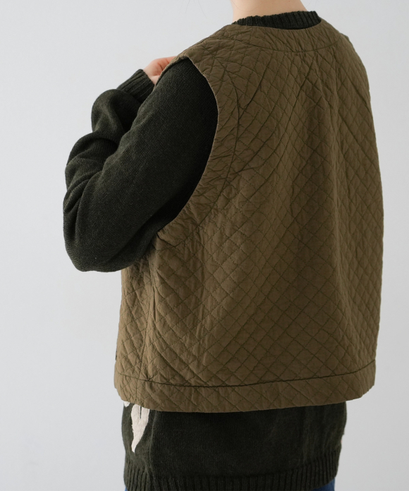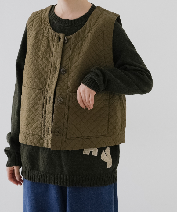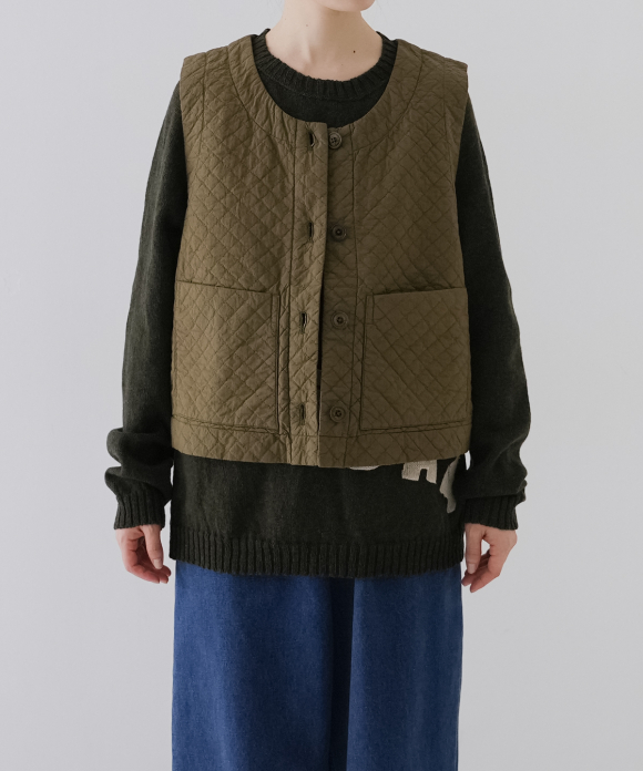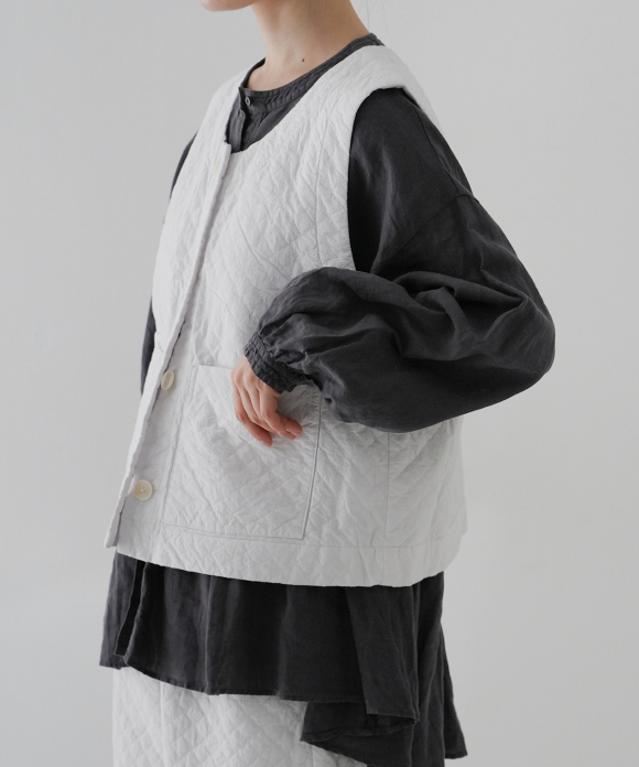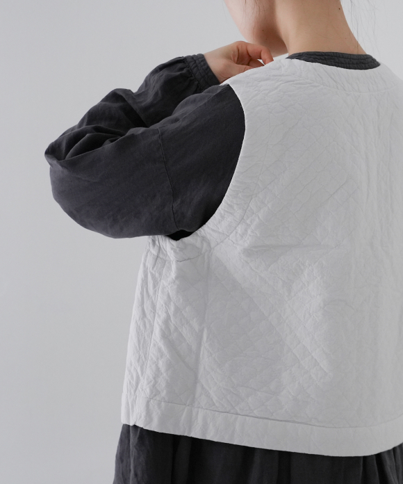 This crew neck vest has a short, boxy silhouette. Like the coat, it is lined with linen, a signature feature of the brand.