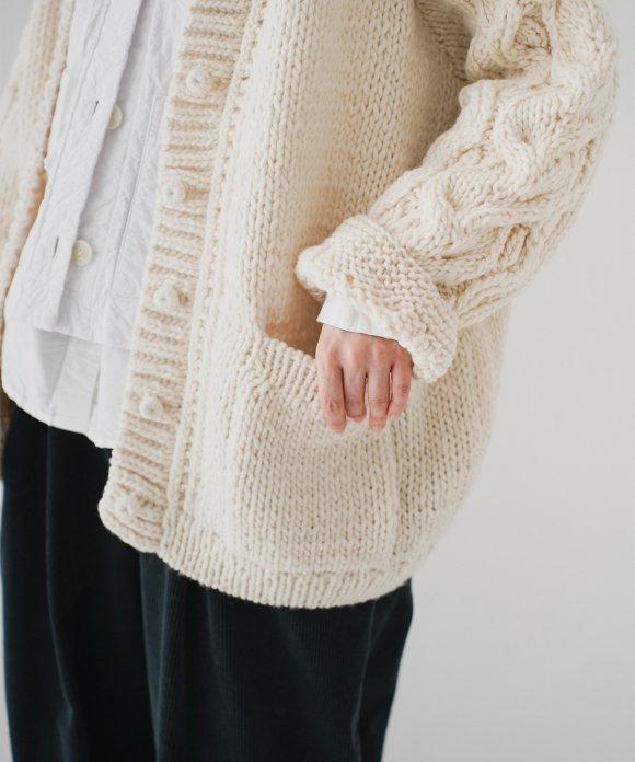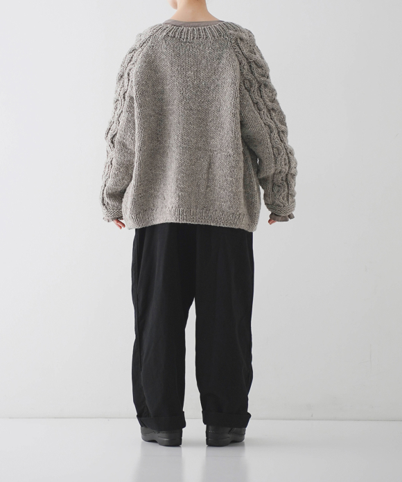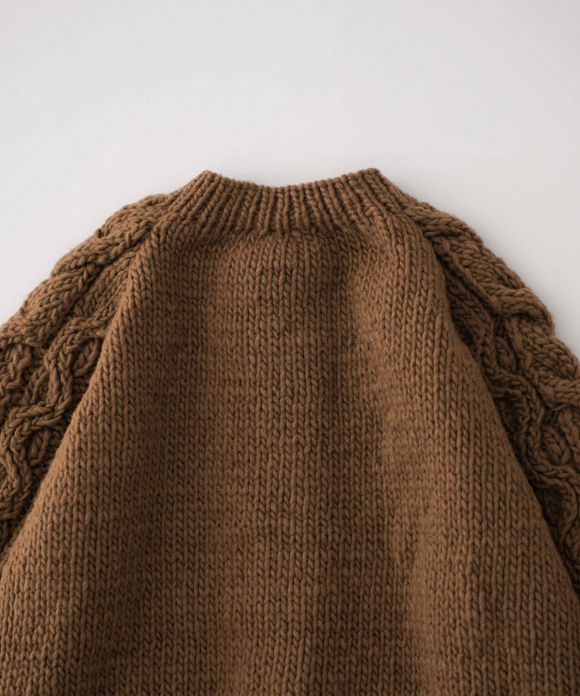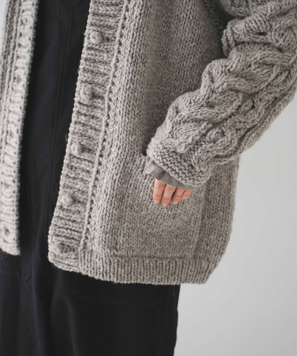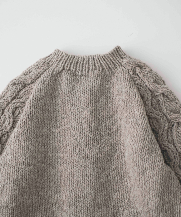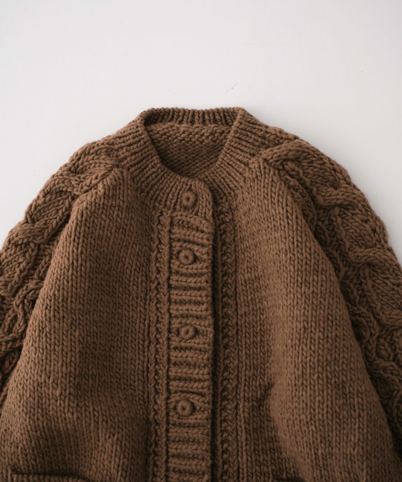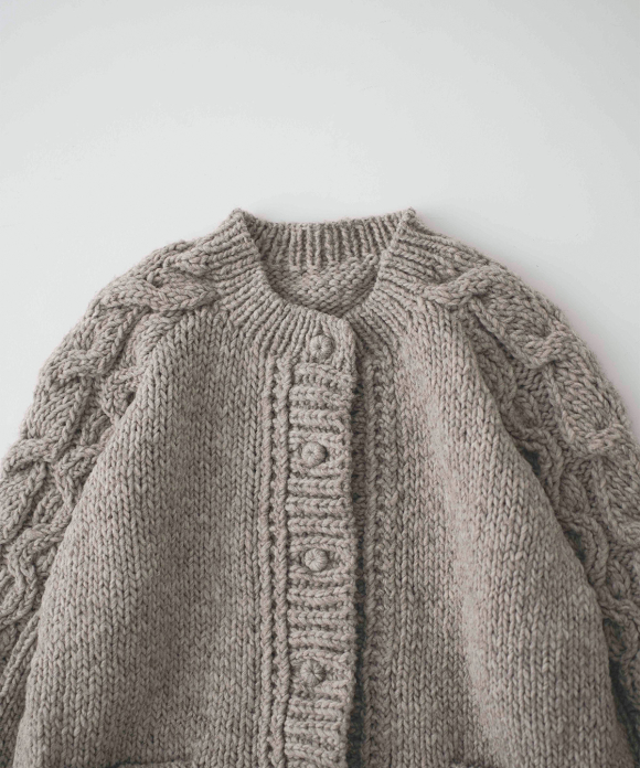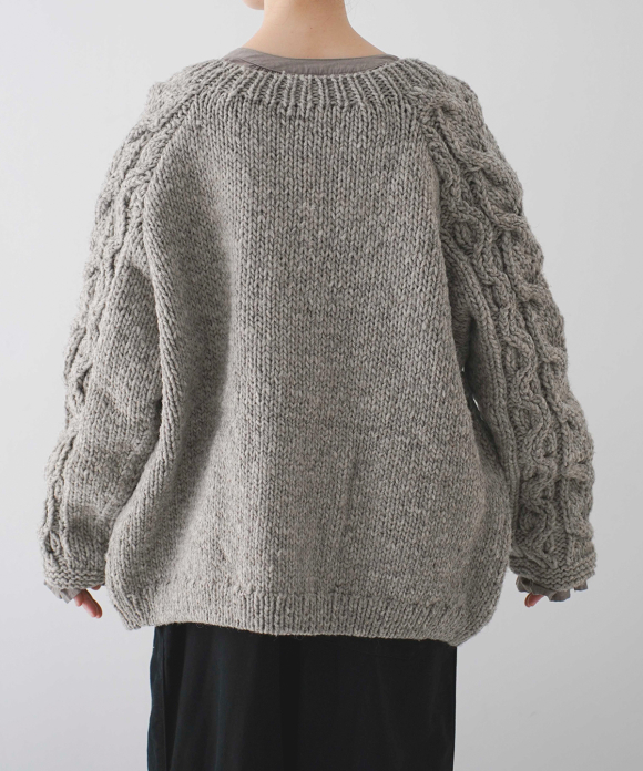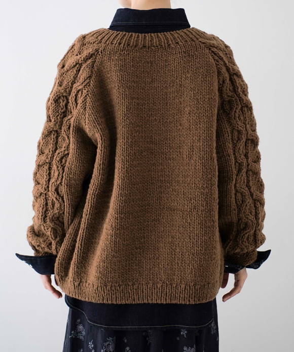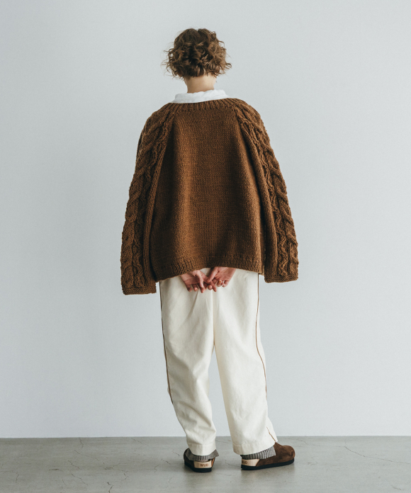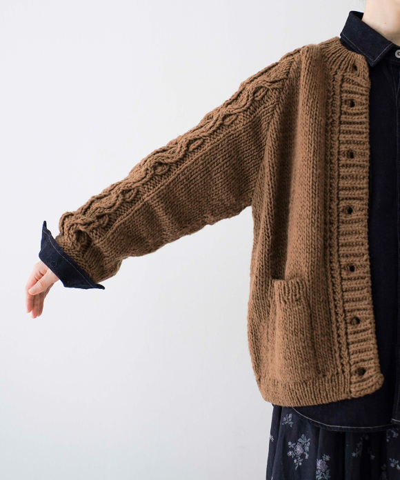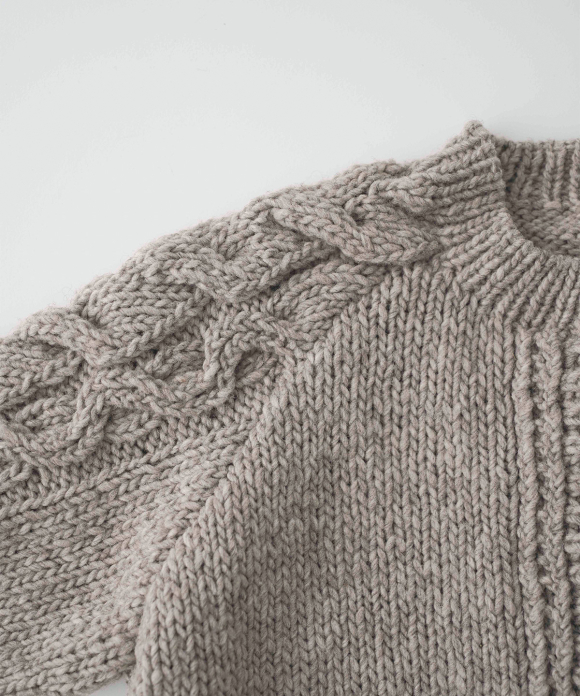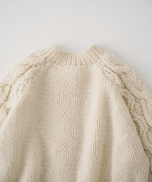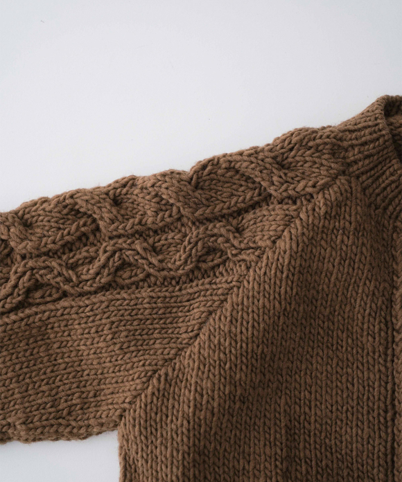 To make it easy to coordinate with any item, the body is intentionally finished in a simple meliad knit with a cable design on the sleeves.