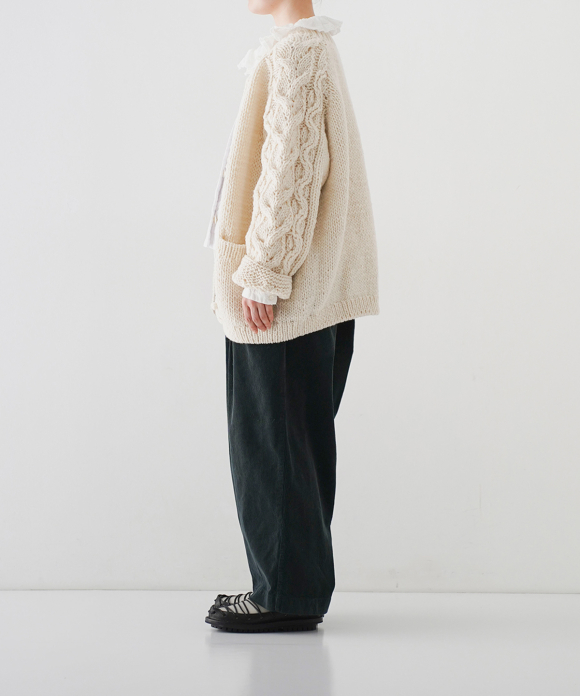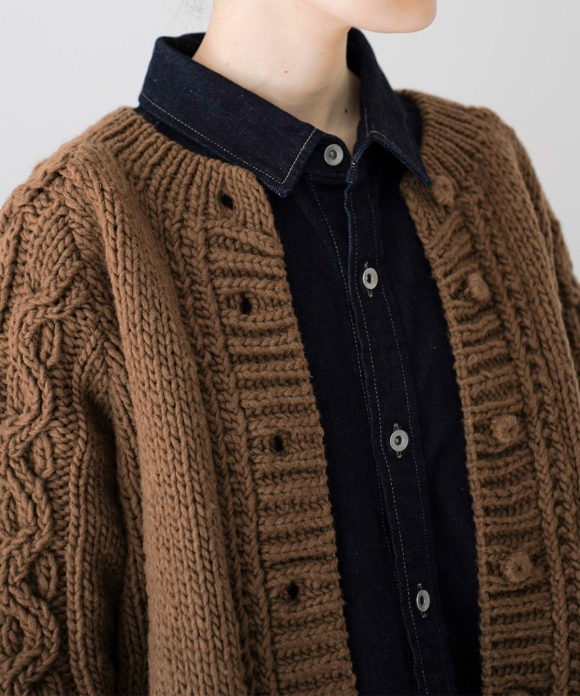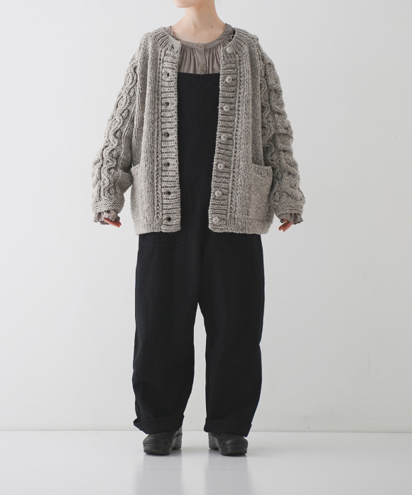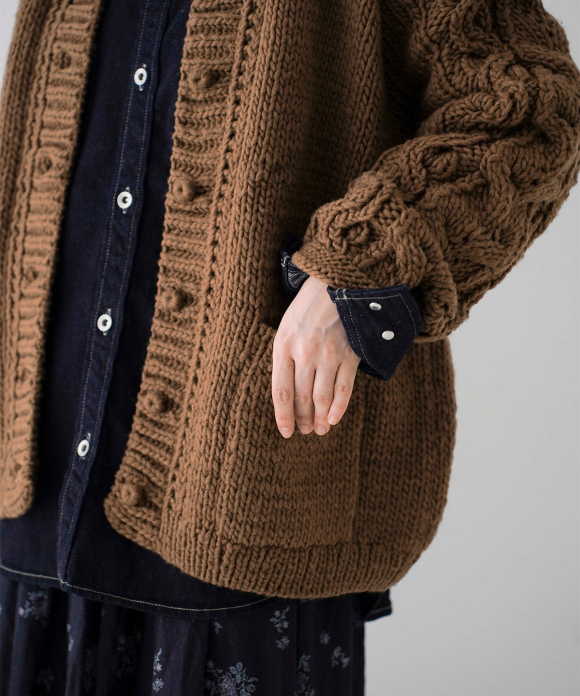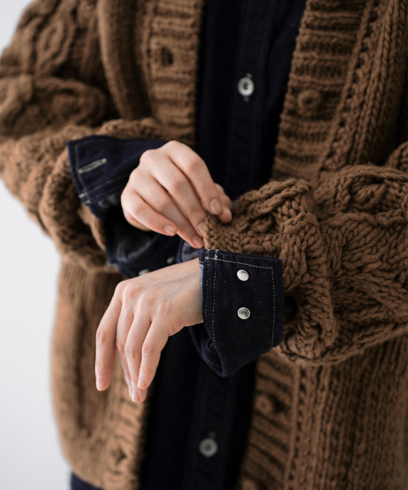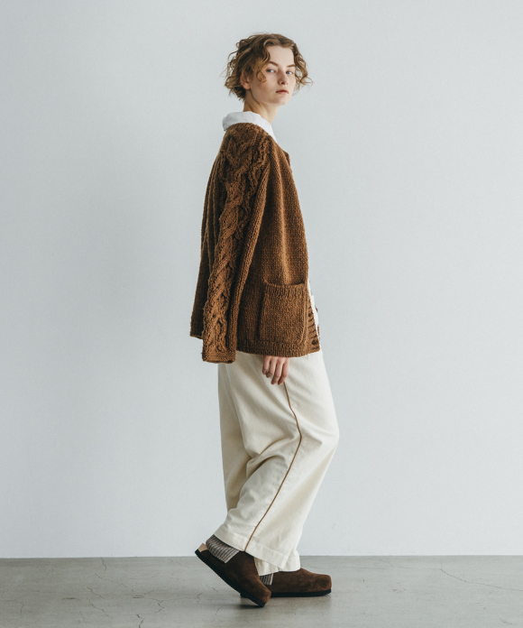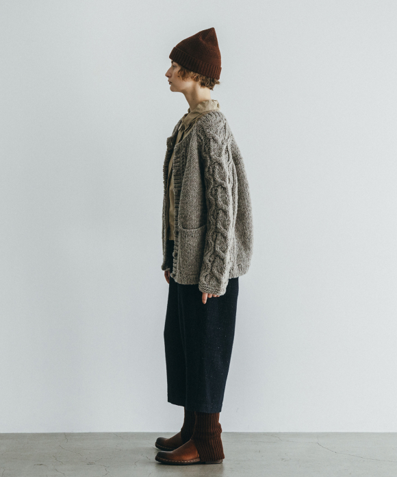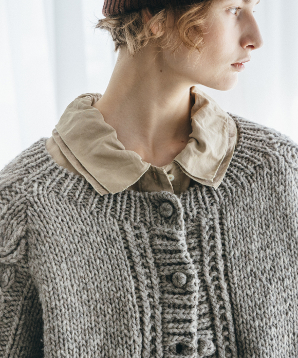 While maintaining a simple and easy-to-coordinate design, we paid particular attention to the cable knit design to make it a special piece. The front is simple meliad knit, but the placket is double rib knit and both sides of the placket have a ground pattern, incorporating a variety of knitting patterns.