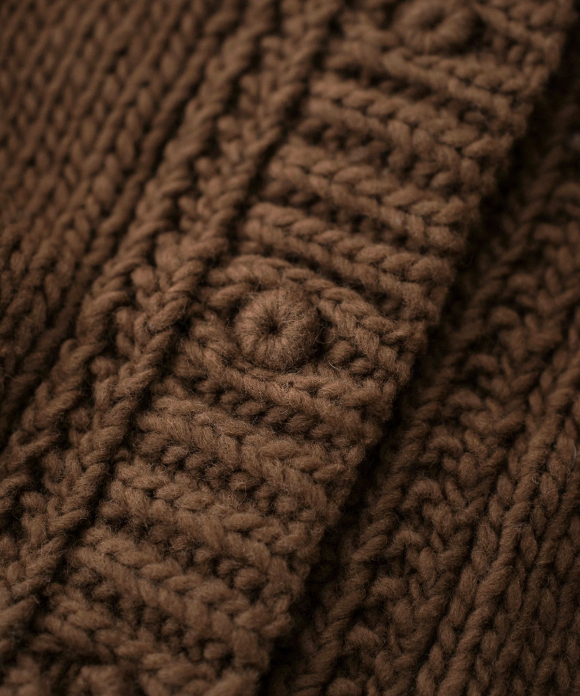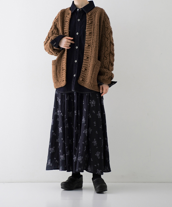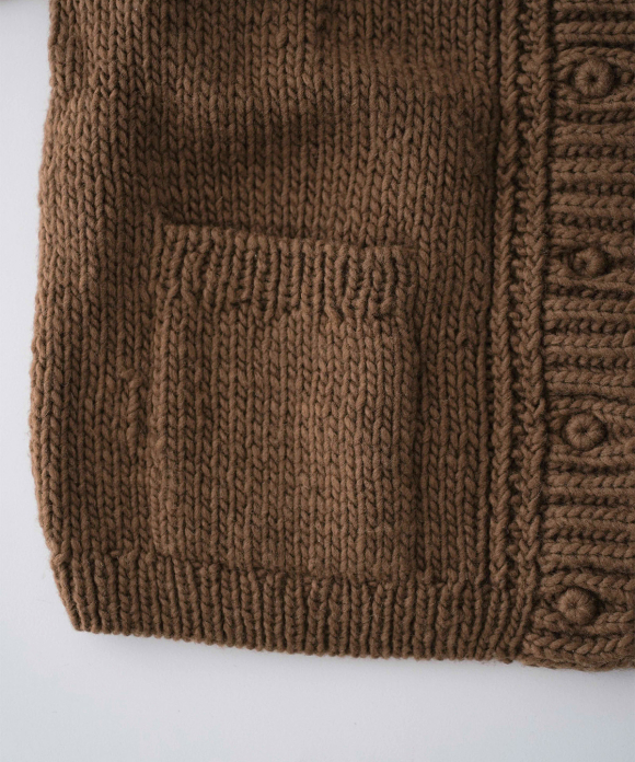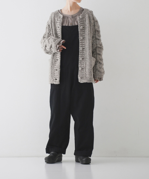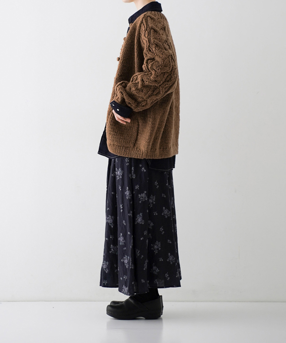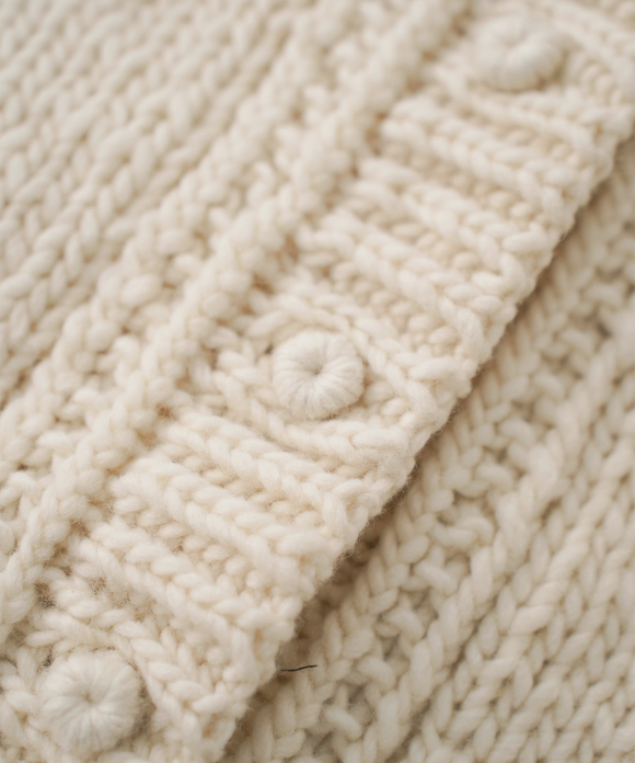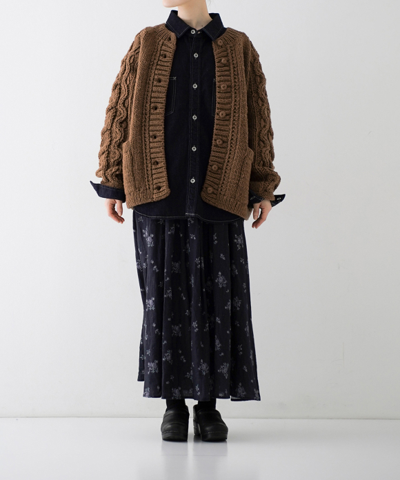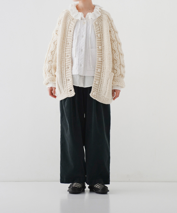 While maintaining a simple and easy-to-coordinate design, we paid particular attention to the cable knit design to make it a special piece. The front is simple meliad knit, but the placket is double rib knit and both sides of the placket have a ground pattern, incorporating a variety of knitting patterns.