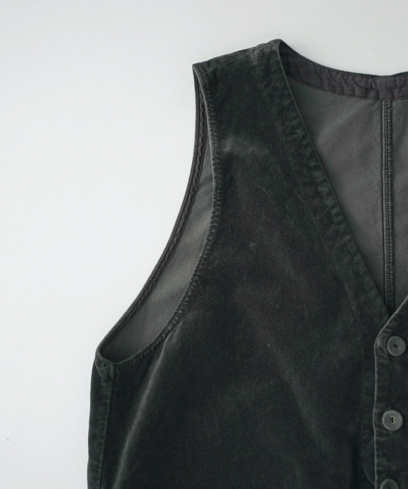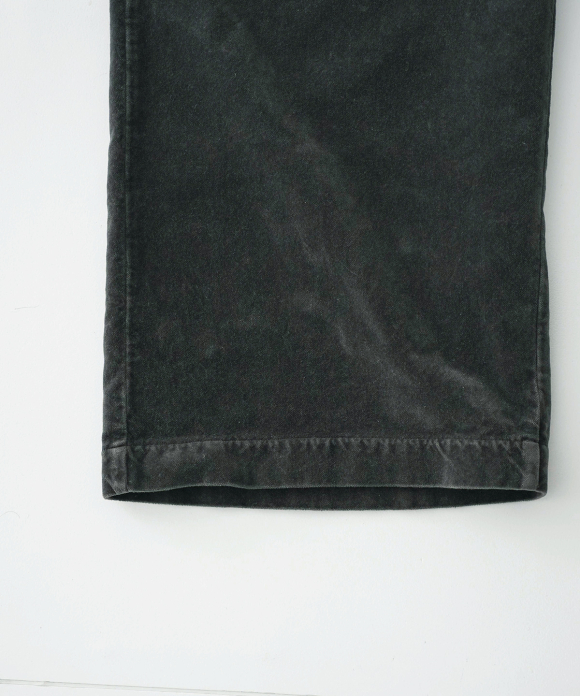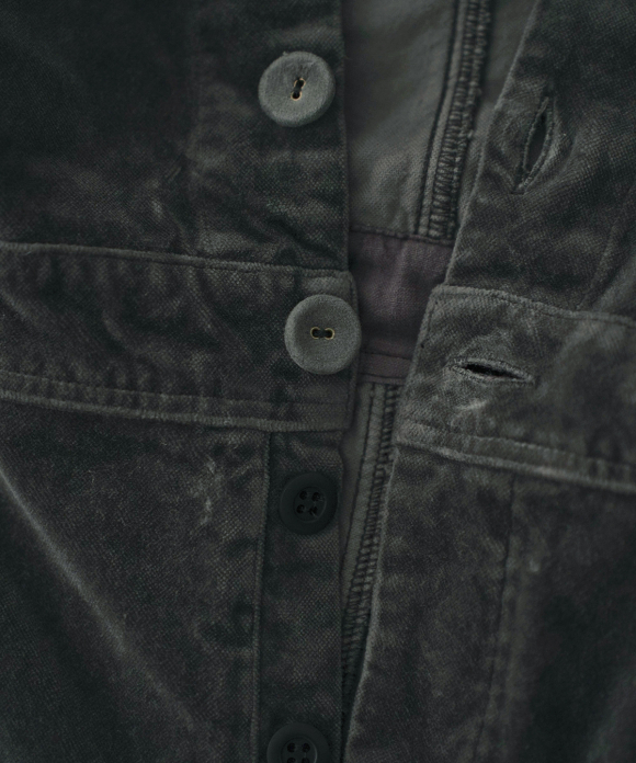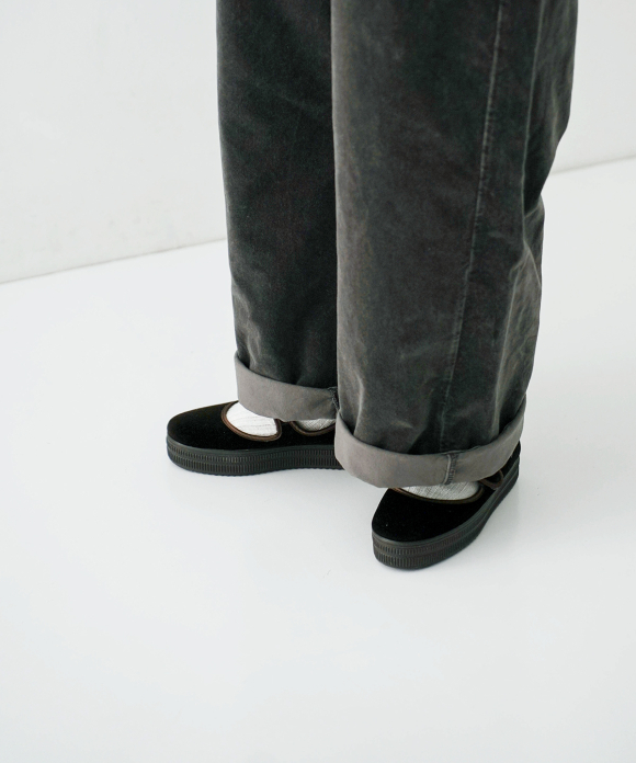 The material has a refined sheen and luster and a heavy feel, and by garment dyeing it, we have created a luxurious yet atmospheric texture.