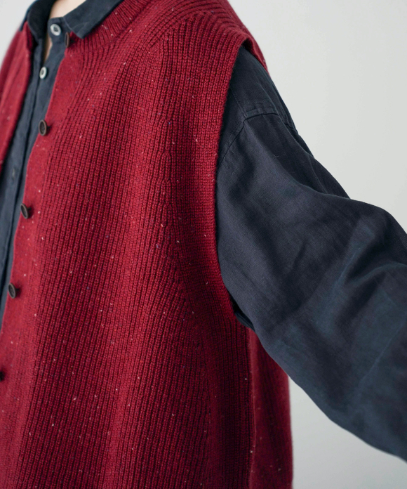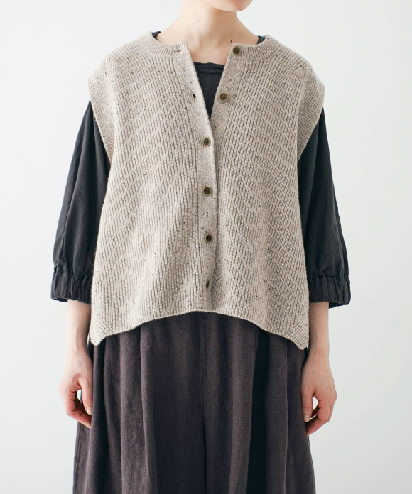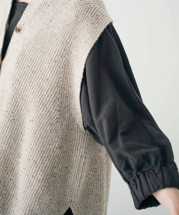 It has a relaxed silhouette with a wide body and wide cuffs, allowing you to layer it comfortably over a blouse with larger sleeves.