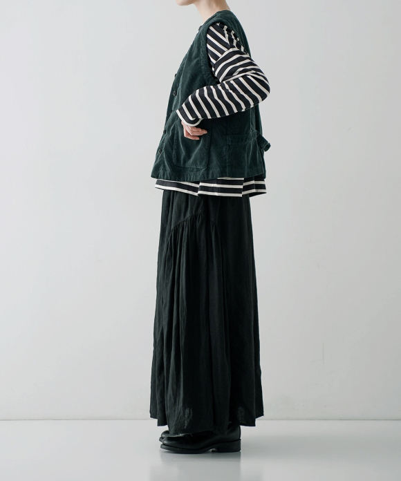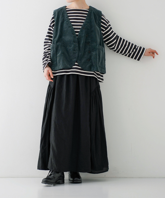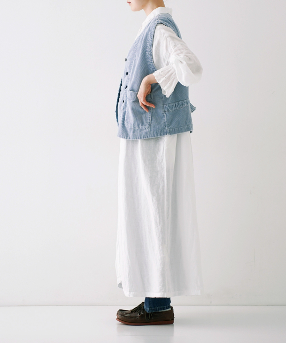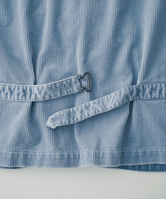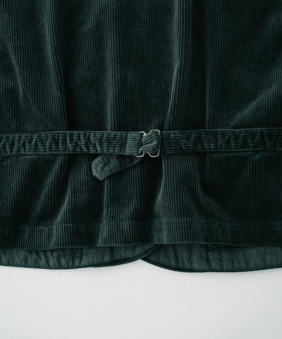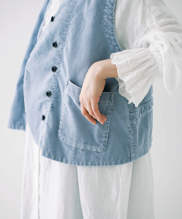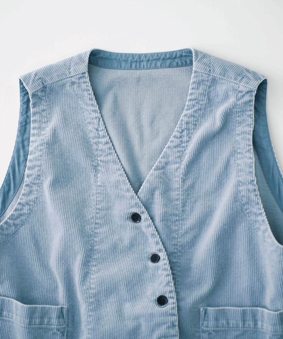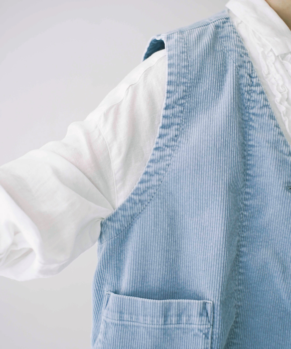 The light blue fabric is pigment-dyed and has been given a ball bio-processing treatment to give it a faded look. It has a slightly vintage, rough finish. Furthermore, dark green is a color exclusive to the online shop, and the deep peacock green color makes a great accent color that is easy to incorporate into your outfits.