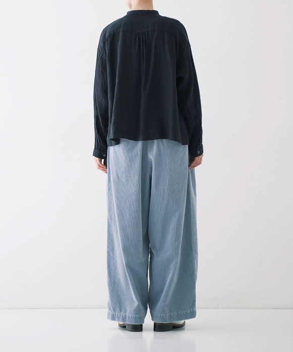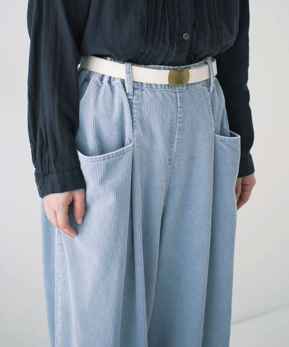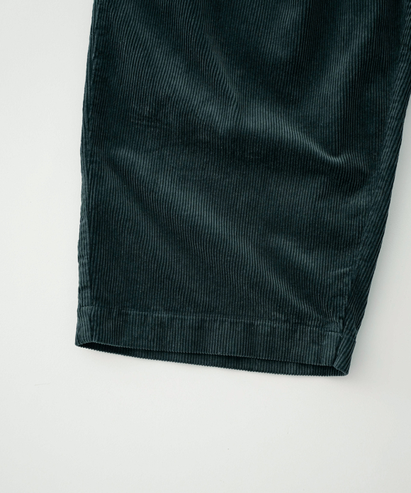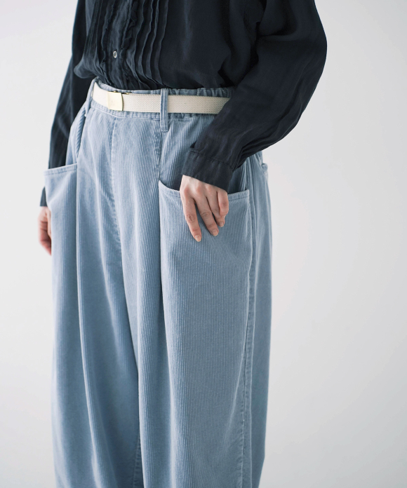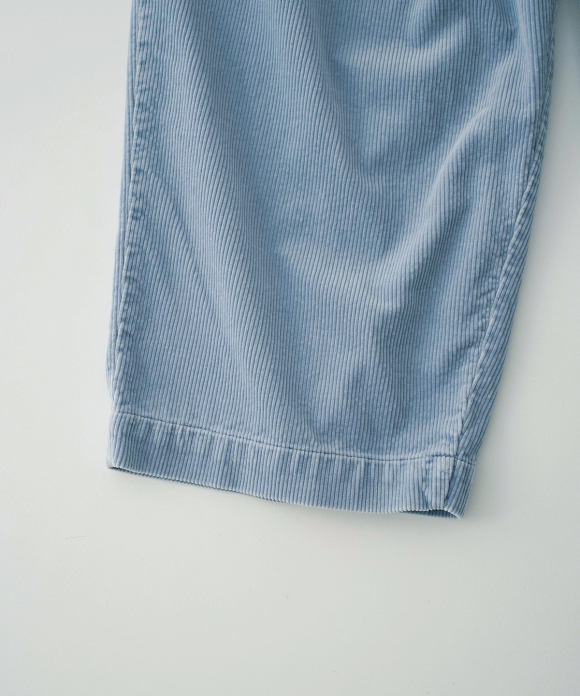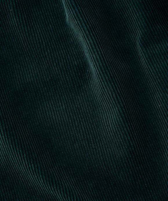 The light blue fabric is pigment-dyed and has been given a ball bio-processing treatment to give it a faded look. It has a slightly vintage, rough finish. Dark green is also a color exclusive to the online shop, and its deep peacock green color makes it an easy accent color to incorporate into your outfits.