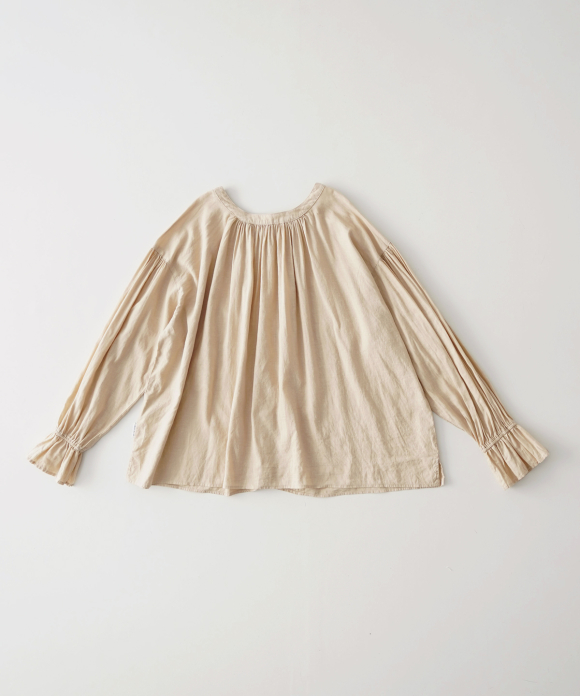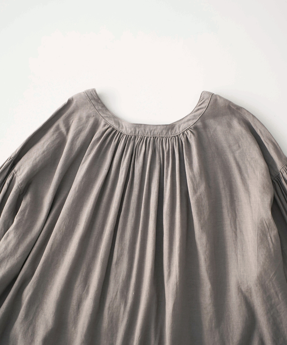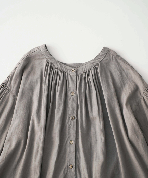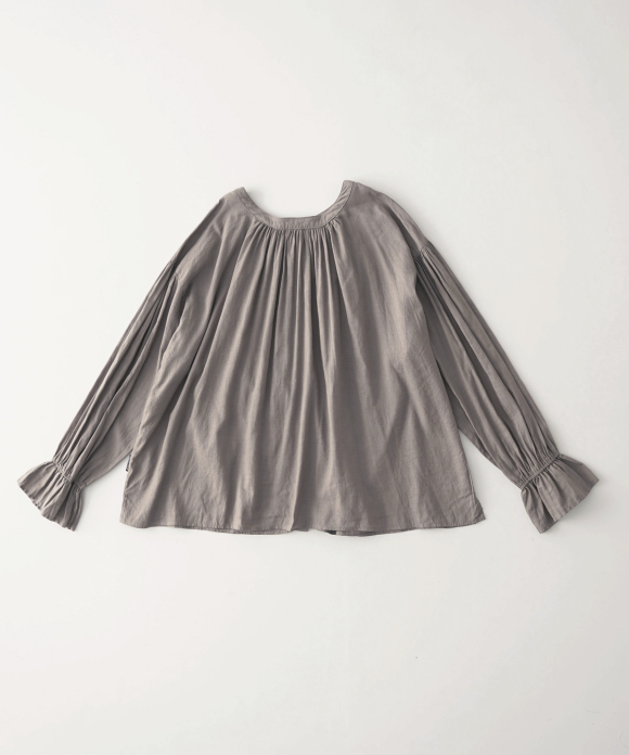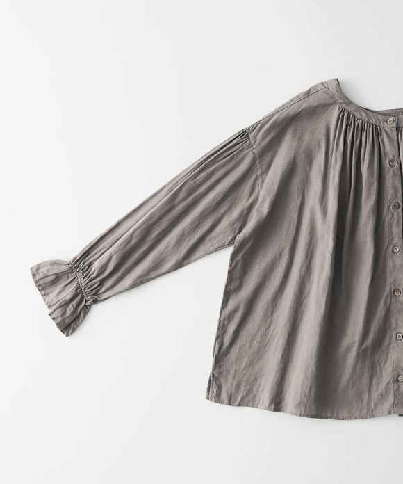 Gathered collar and ruffled cuffs add a touch of elegance to the simple design.
