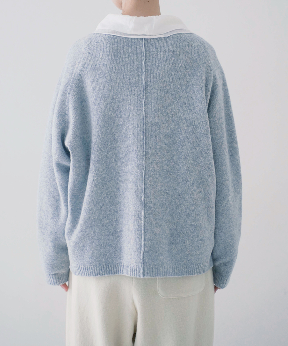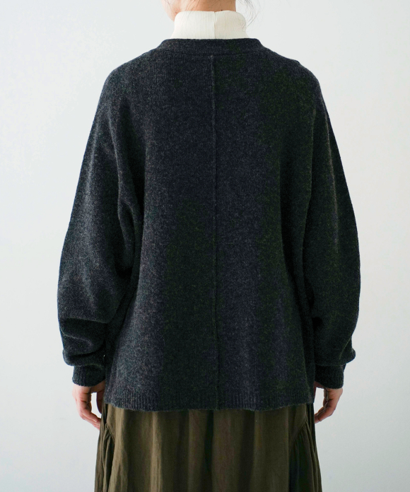 The V-neck design goes well with layering with blouses that have an accent collar, and the knitted accent at the center of the back adds a subtle touch.
