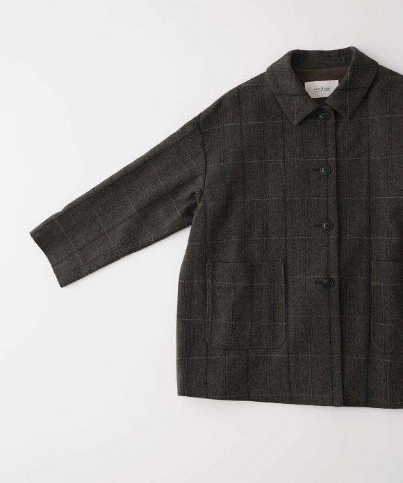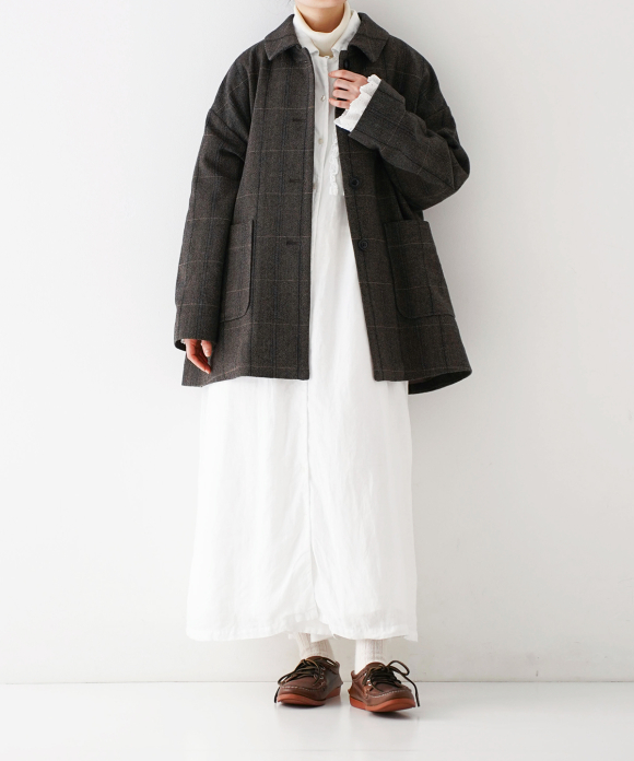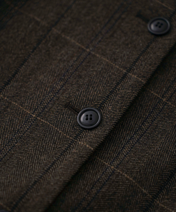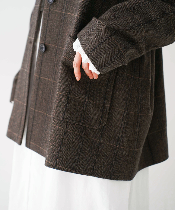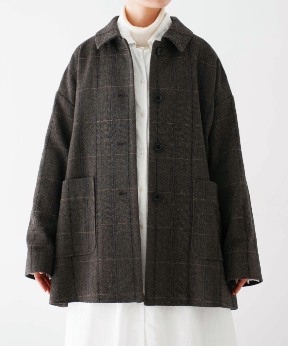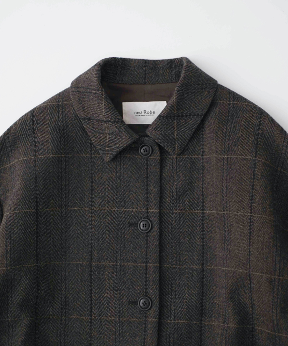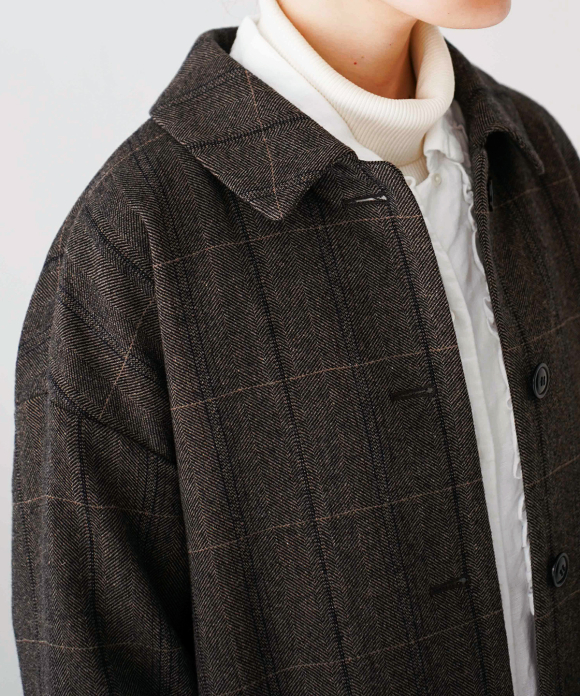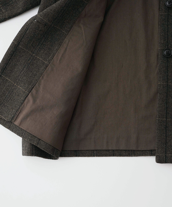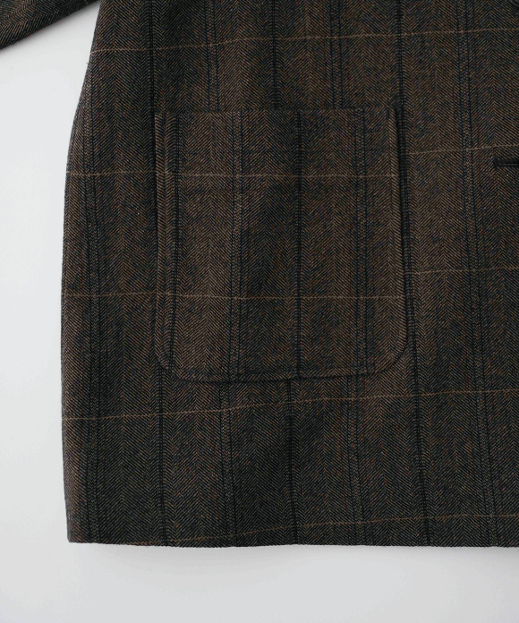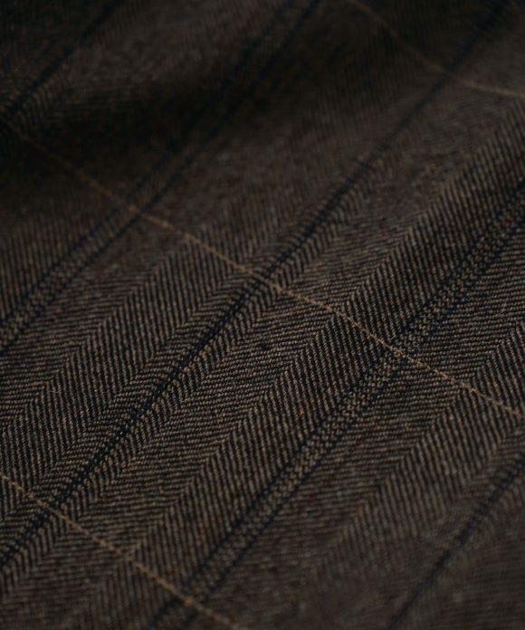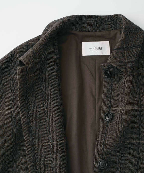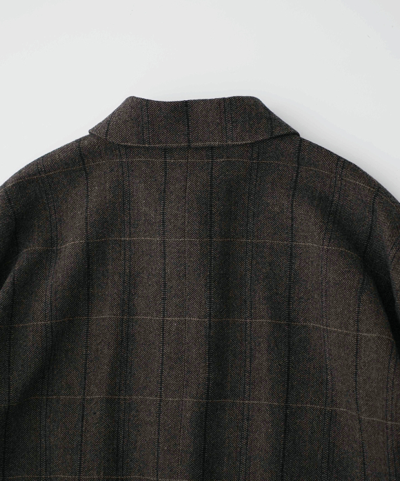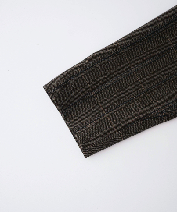 The warp threads are a 1:1 mix of wool and nylon original top yarns, and the weft threads are woven with 100% wool yarns of different counts to change the balance of the fabric, and a washer treatment is used to create a vintage look. The check pattern is added to the HERRINBORN weave to create a one-of-a-kind pattern.