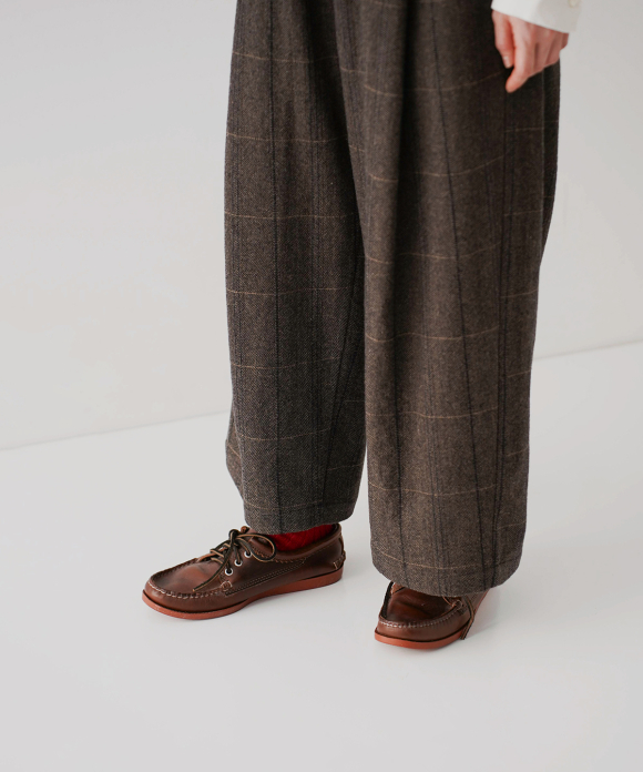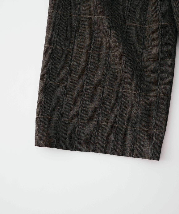 The warp threads are a 1:1 mix of wool and nylon original top yarns, and the weft threads are woven with 100% wool yarns of different counts to change the balance of the fabric, and a washer treatment is used to create a vintage look. The check pattern is added to the HERRINBORN weave to create a one-of-a-kind pattern.