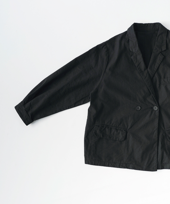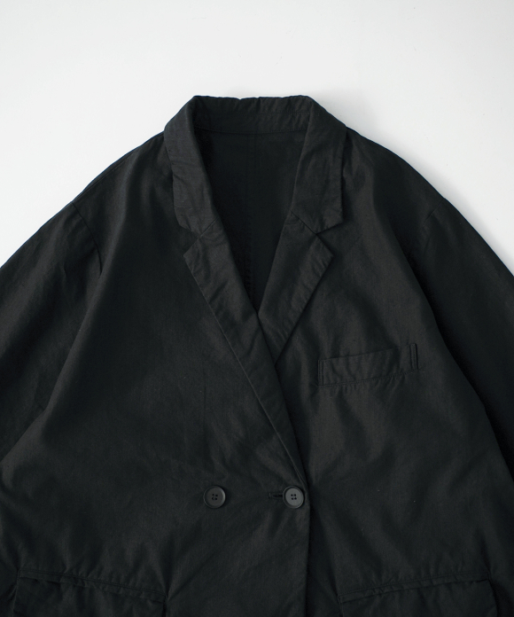 The flap pockets and chest pocket incorporate masculine details, while the cuffs and tucks at the sleeves add volume overall, creating a feminine design.