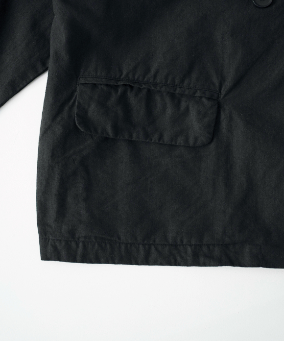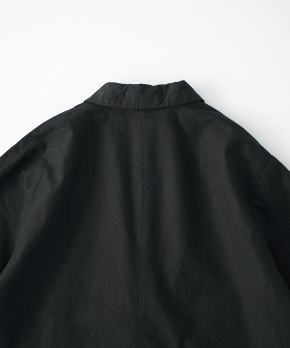 This tailored jacket is crafted from a single piece of cotton linen.