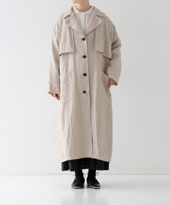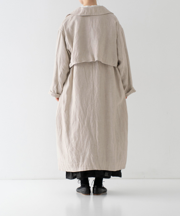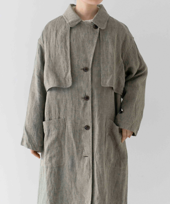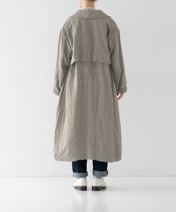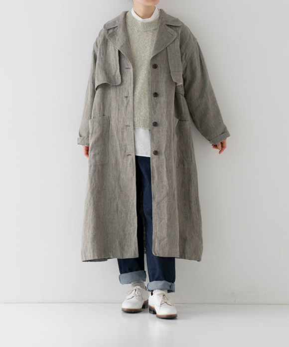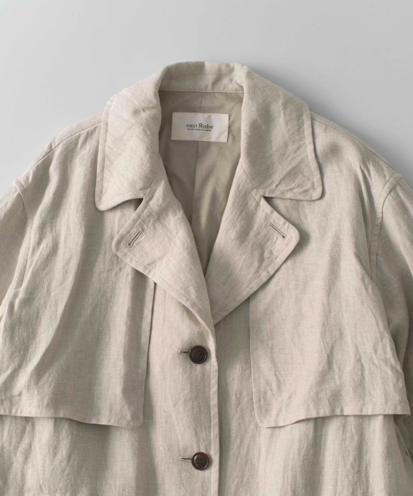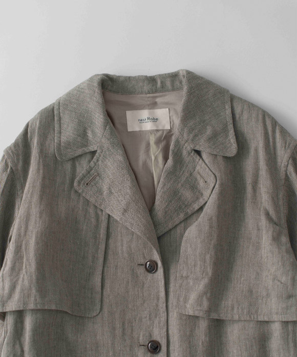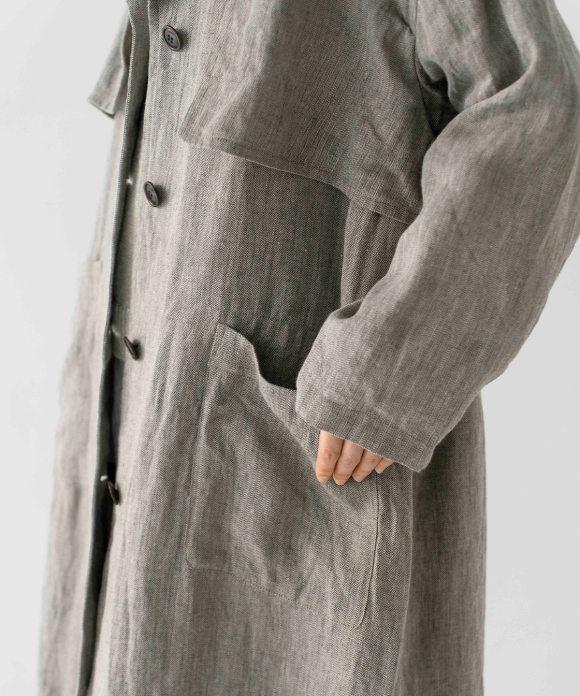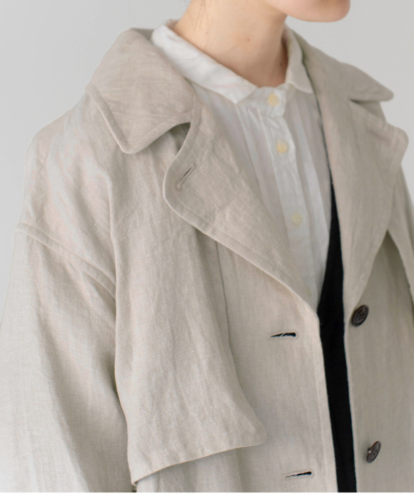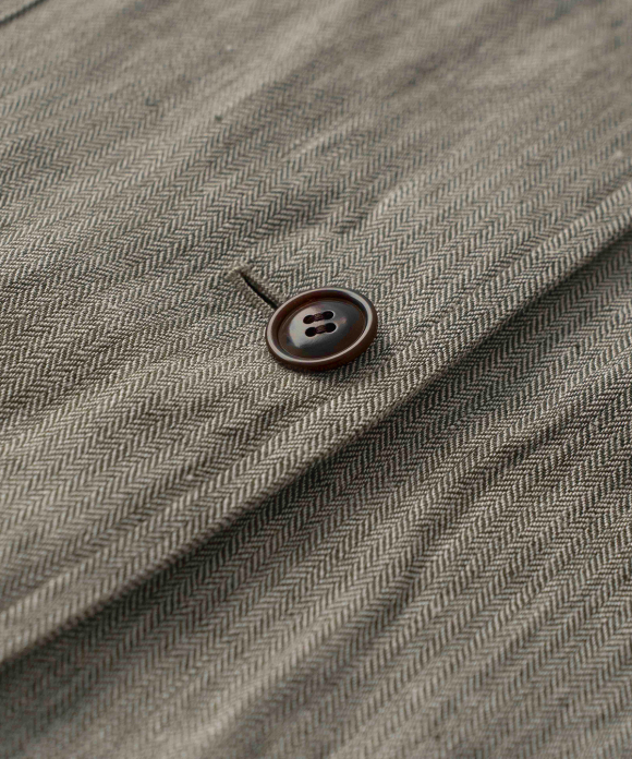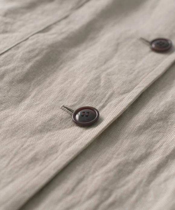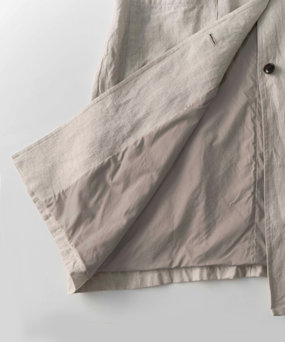 The outer fabric is made from 100% linen. This custom-made herringbone weave combines the natural softness and breathability of linen, making it comfortable to wear throughout the transition between seasons.