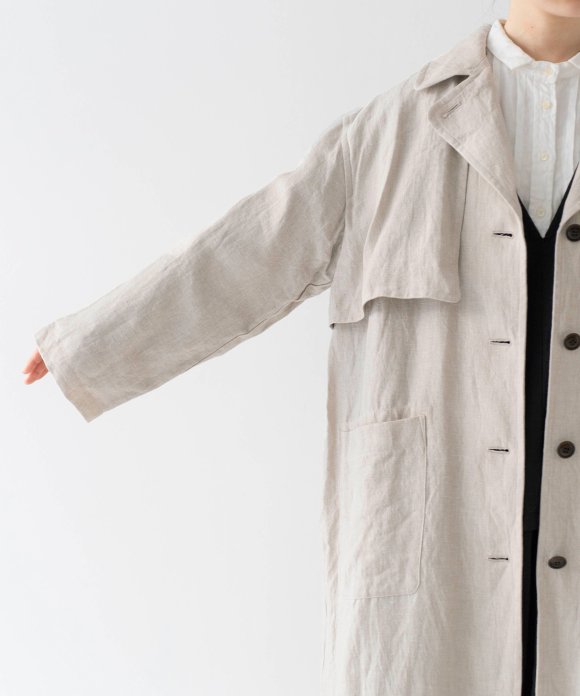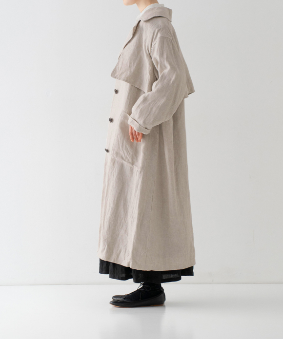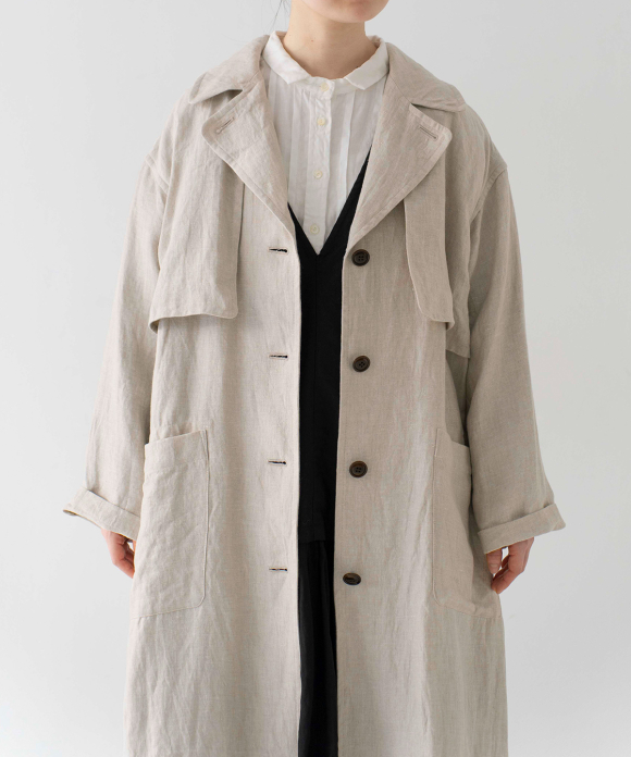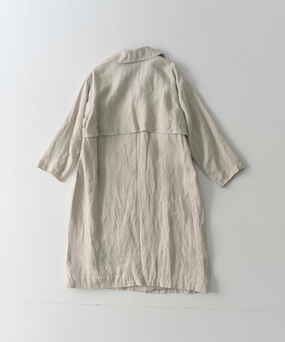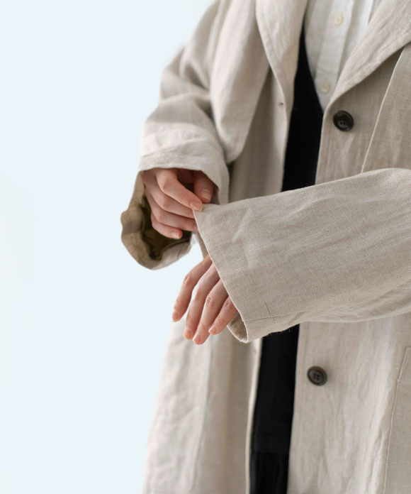 The fabric is woven at a weaving factory in Mie Prefecture, and finished in Ichinomiya City, Aichi Prefecture, using air and a wet tumbler to bring out the firmness and stiffness of the linen.