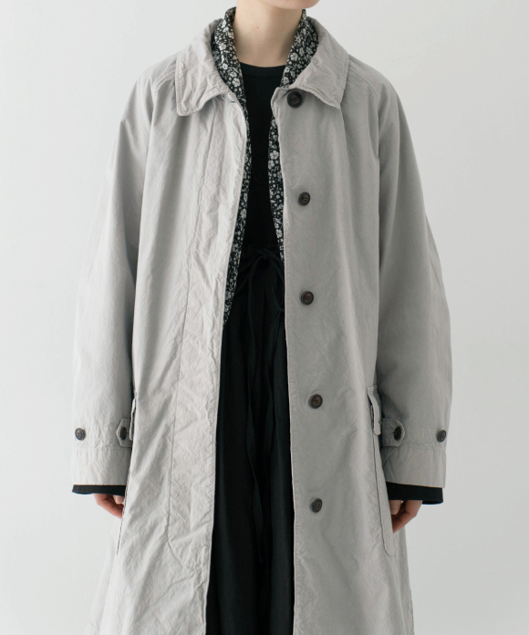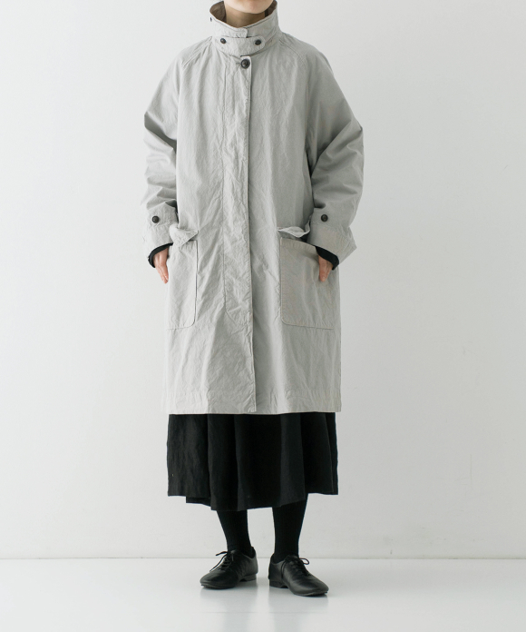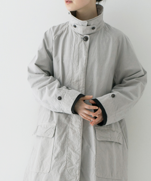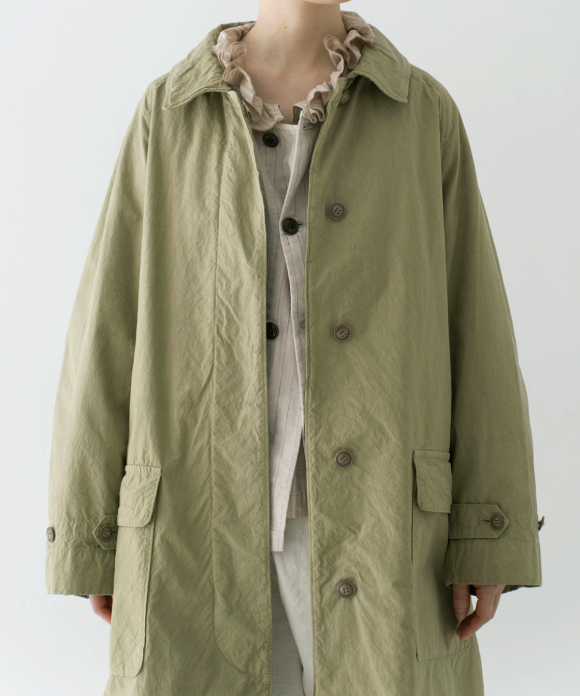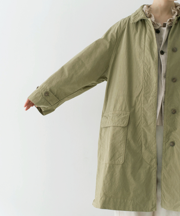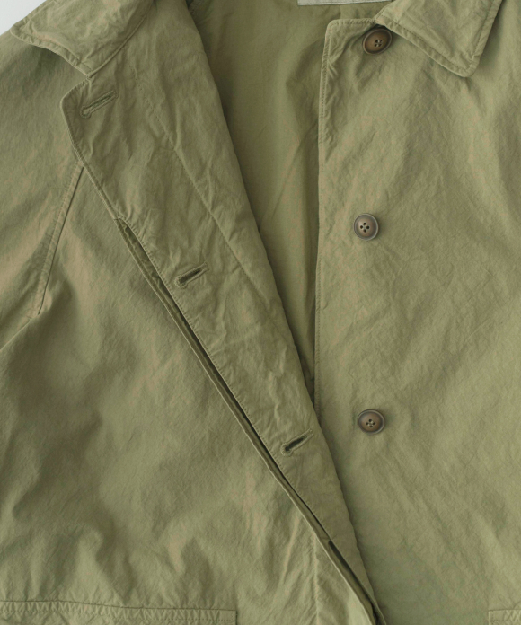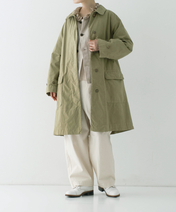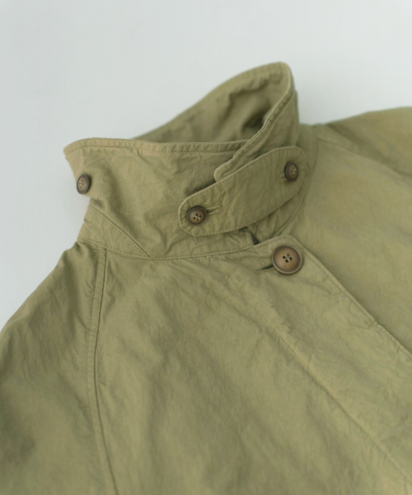 The front is concealed, and the collar with a chin strap can be worn up, making it ideal for cooler weather. The lining is made of satin, so it won't snag when worn, and the natural wrinkles created by garment dyeing and vintage-style buttons add accents to the design.