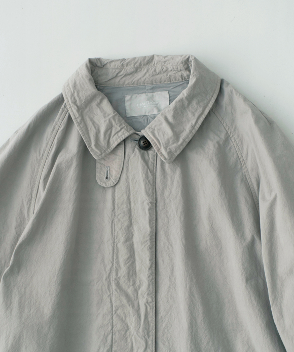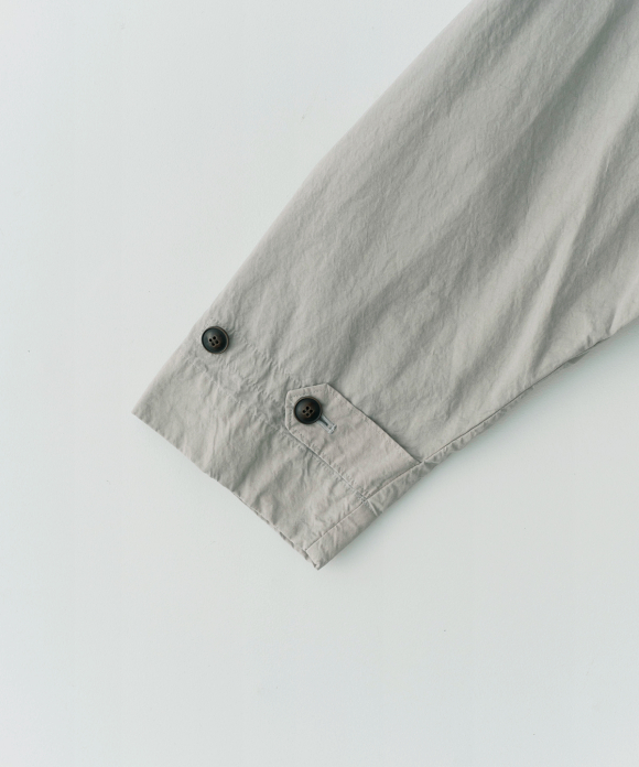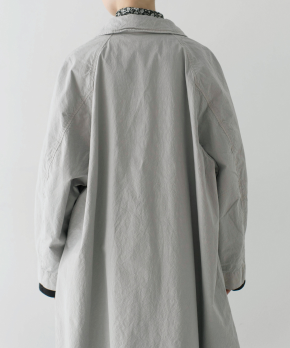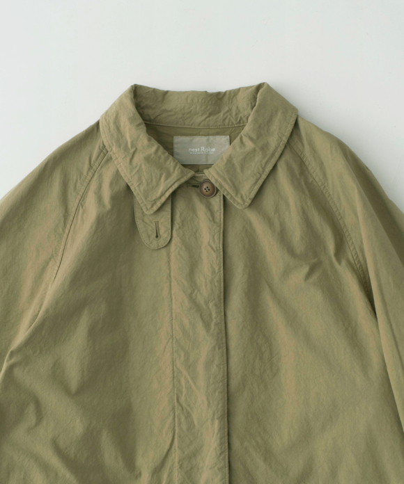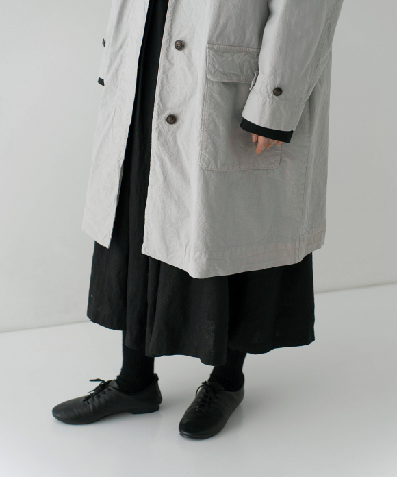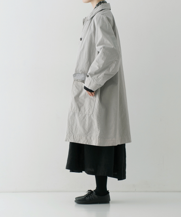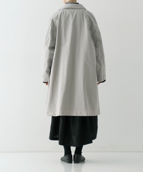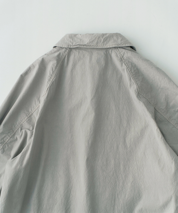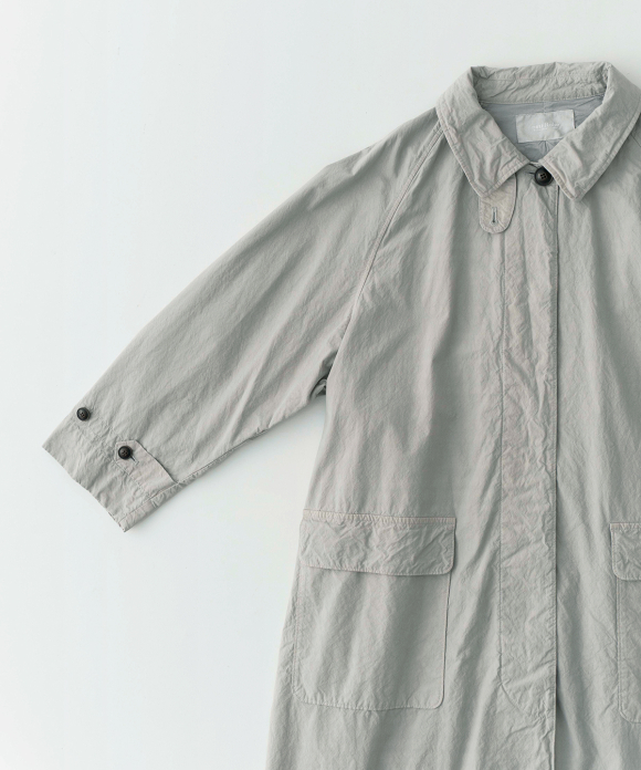 The front is concealed, and the collar with a chin strap can be worn up, making it ideal for cooler weather. The lining is made of satin, so it won't snag when worn, and the natural wrinkles created by garment dyeing and vintage-style buttons add accents to the design.
