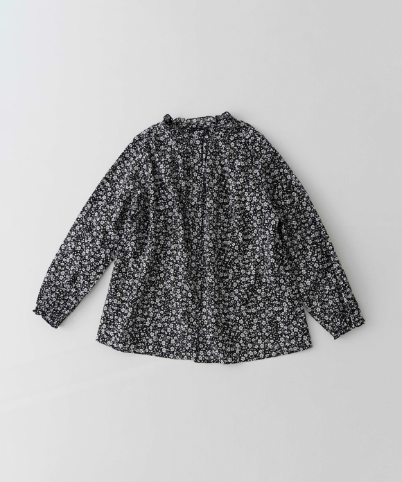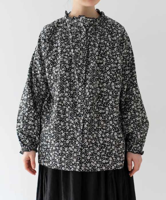 This blouse features a stand-up collar with delicate ruffles at the neckline.