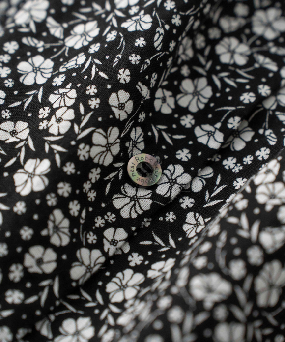 The material is a thick and soft blend of cotton and linen, printed with an original nest Robe floral pattern featuring hemp flowers.