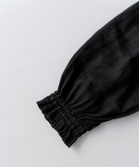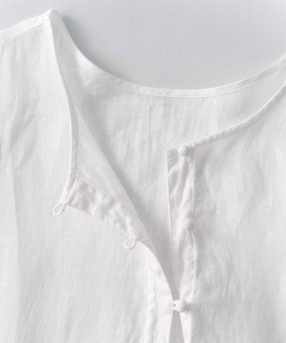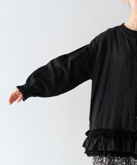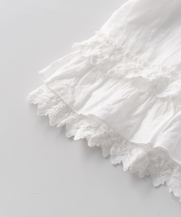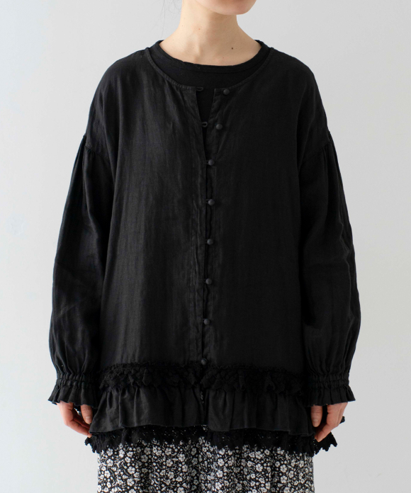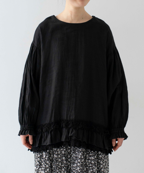 A lightweight blouse made from 60-count linen with delicate lace at the hem.