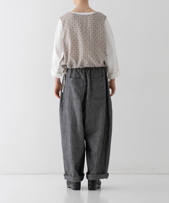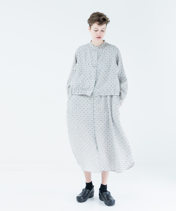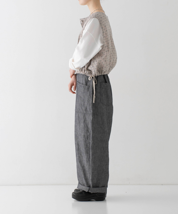 The slightly flared hem has side slits, and tightening the side drawstrings creates gathers, adding a soft, rounded silhouette.