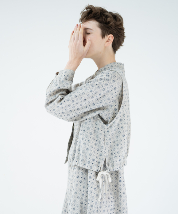 Using natural linen colors as a base, the textile, inspired by vintage block prints, is expressed in a rotary style.