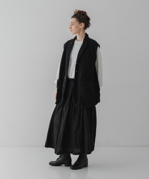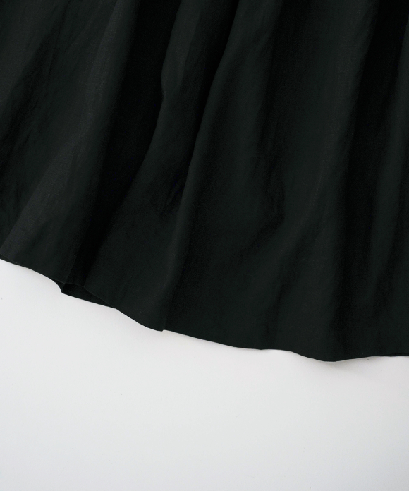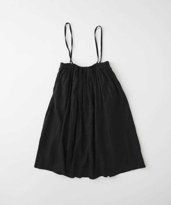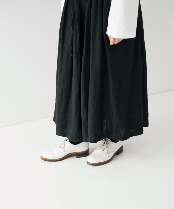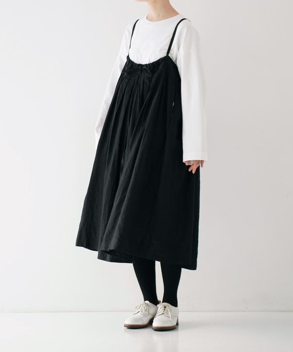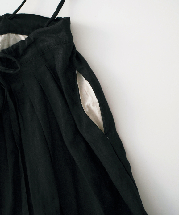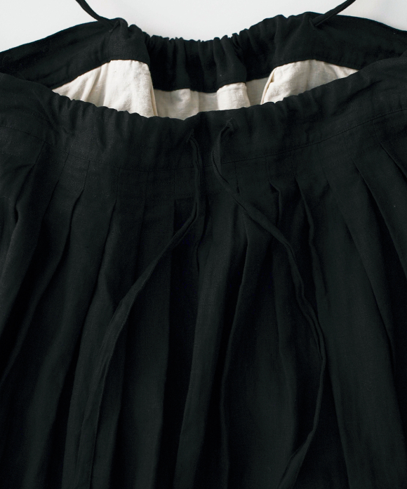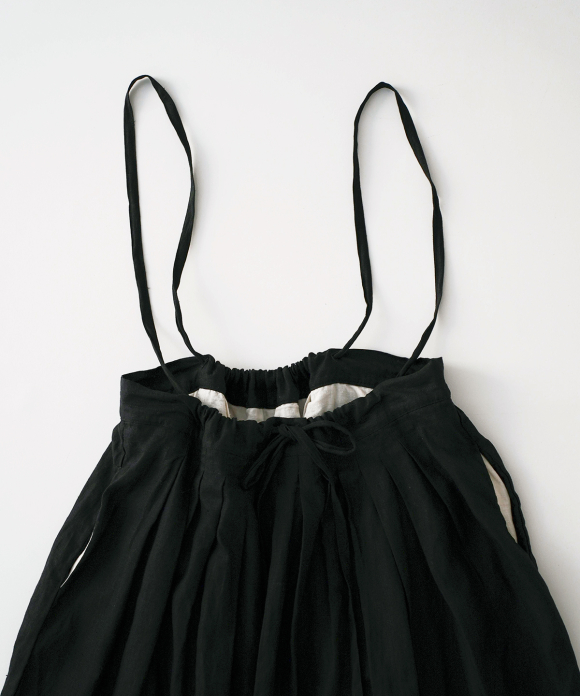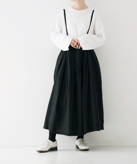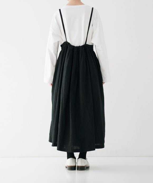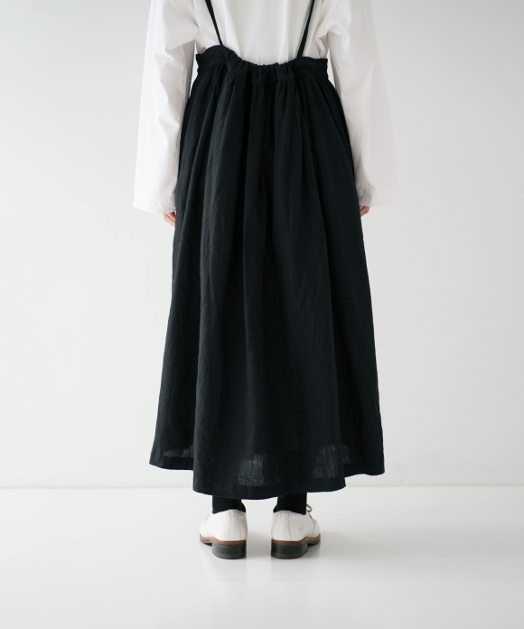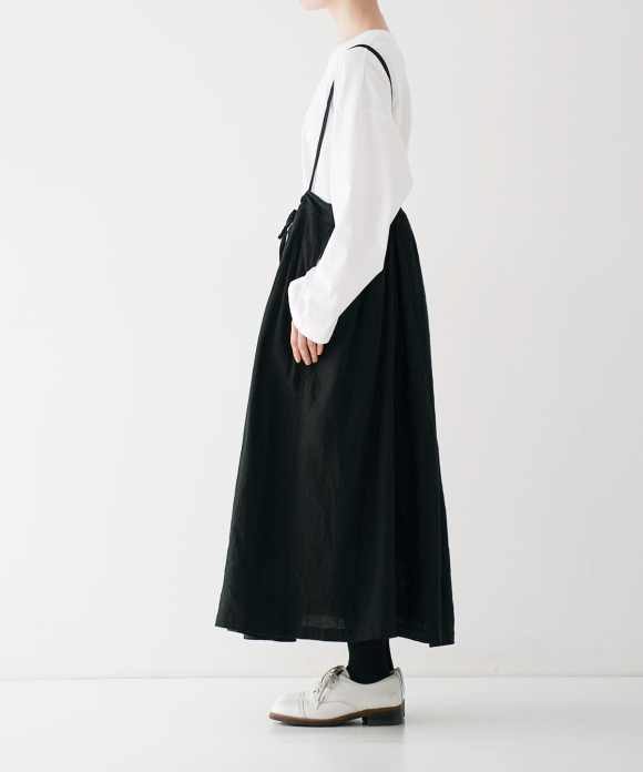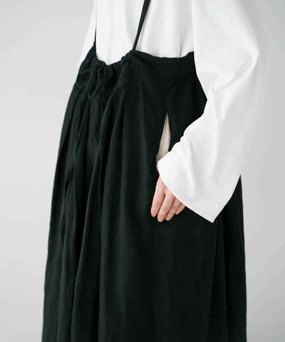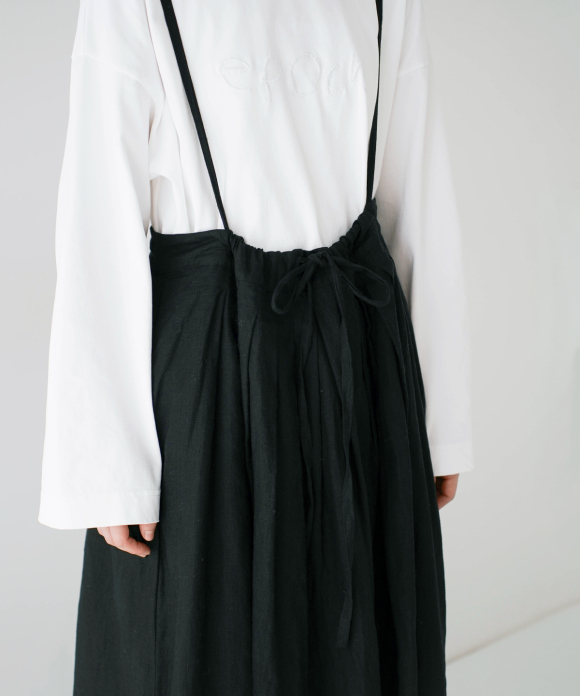This suspender skirt features tucks at the front and a flared silhouette. The outer fabric is made of 100% linen, while the lining is made of off-white napped fabric, giving it the feel of a vintage skirt.