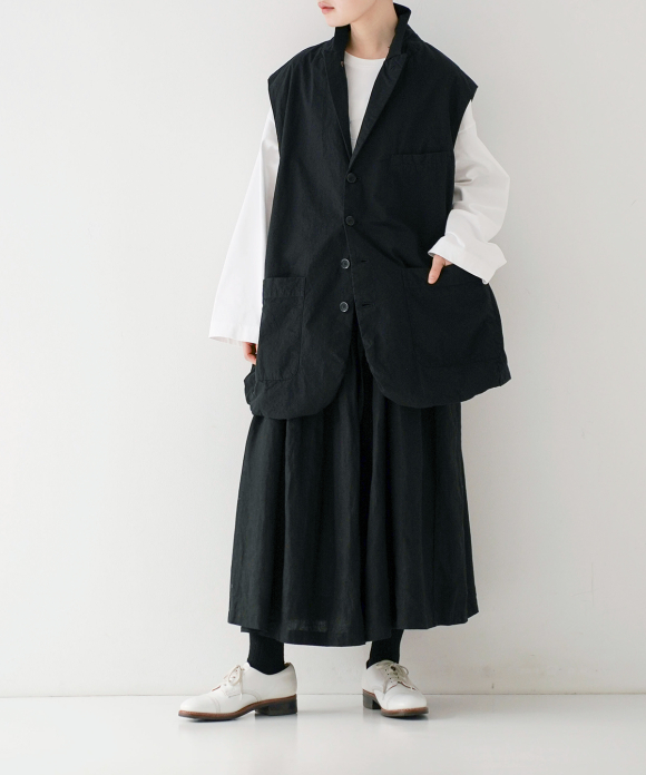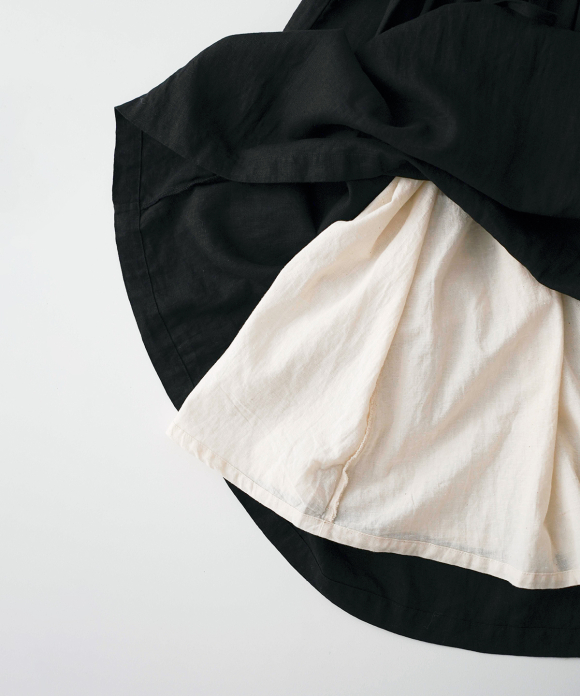 The outer fabric is made from classic plain weave linen, while the lining is woven in Nishiwaki City, Hyogo Prefecture, using cotton warp threads and thick nep yarn weft for a textured cotton plain weave. Slow weaving on a shuttle loom gives it a soft, vintage-like texture.