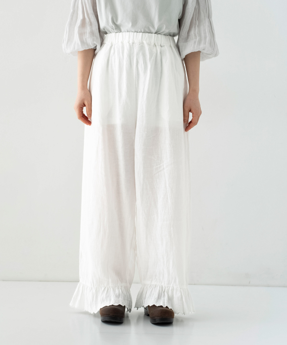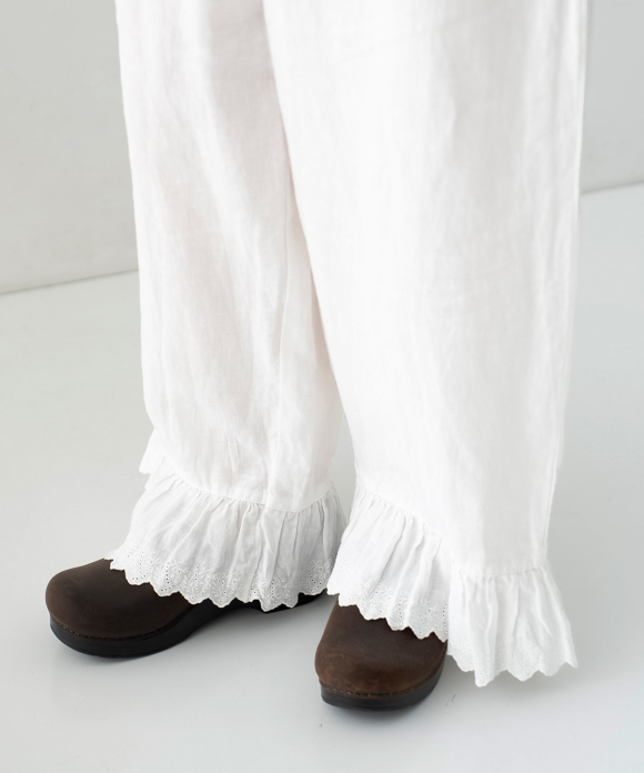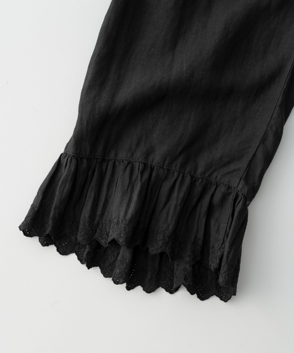 The lace fabric is an original lace made from the same 60/- x 40/- linen as the outer fabric, with embroidery created from scratch.