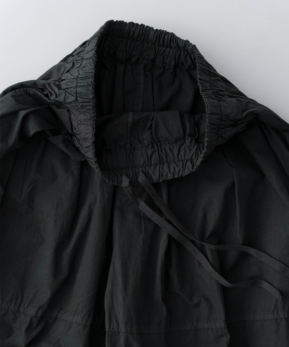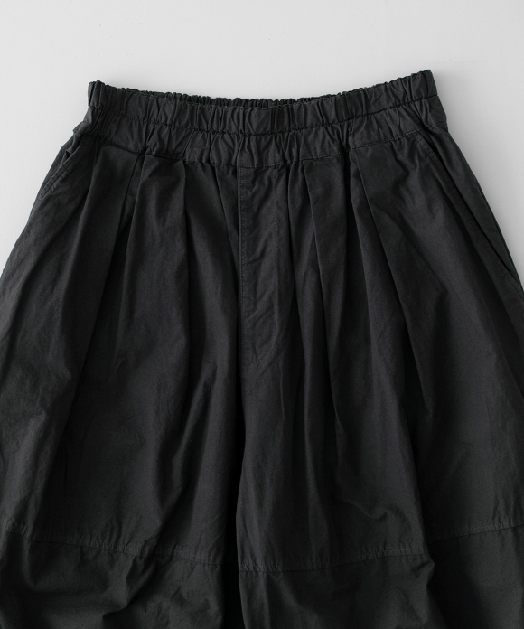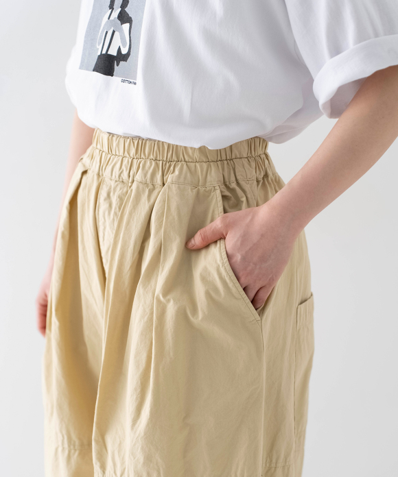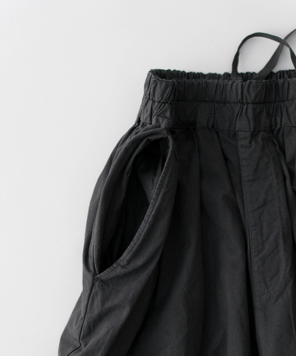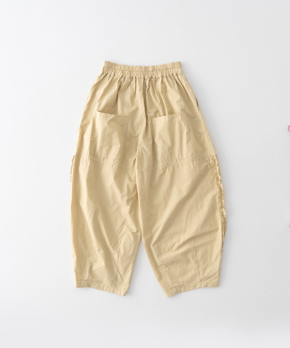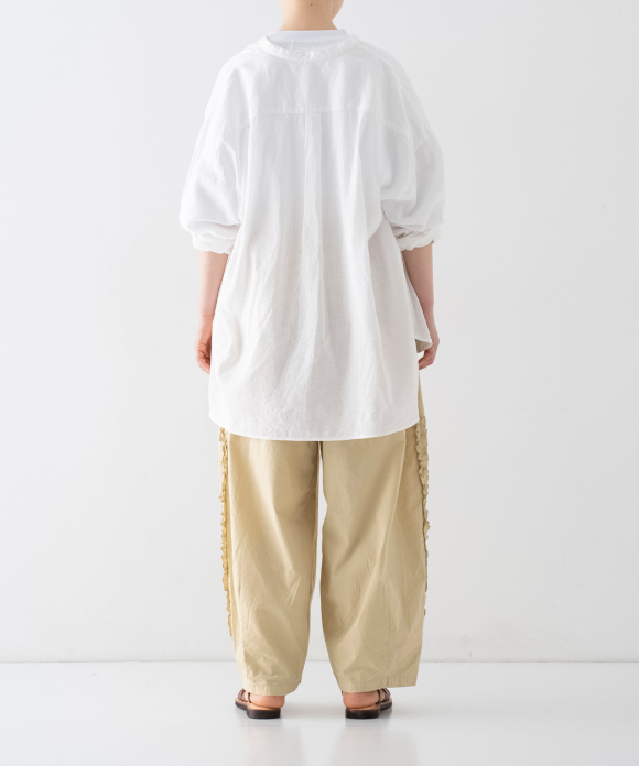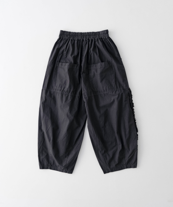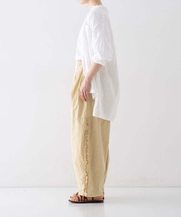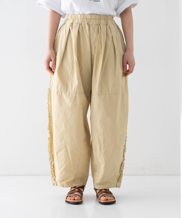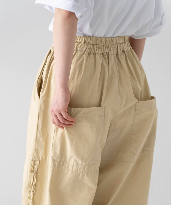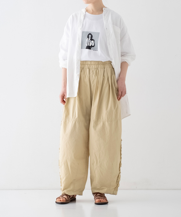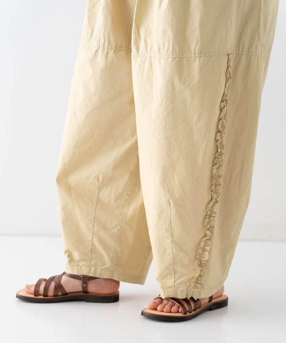 These easy pants feature playful touches with small ruffles hidden along the side seams. Darts at the hem create a rounded, three-dimensional silhouette. With features like a drawstring waist and deliberately low-positioned back pockets, these bottoms offer the functional beauty of workwear while balancing it with the sweetness of ruffles. The relaxed fit, combined with the unique form that utilizes the fabric's properties, creates a clean and streamlined look around the ankles. We also recommend pairing them with the blouse from the same series for a coordinated and soft look.