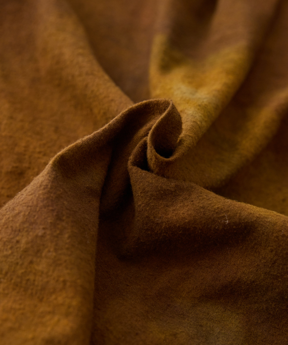 The texture changes with washing, and the fabric acquires volume, developing a dense yet comfortably soft texture. Due to the different yarn mixes and the brushing process, unevenness occurs after dyeing depending on the color, resulting in a rich, deep color expression.