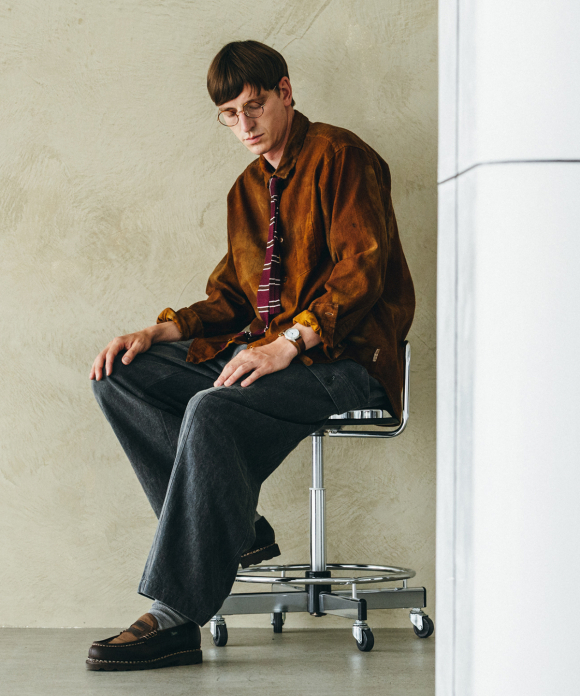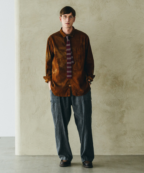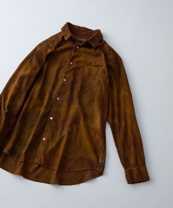 The brand's classic regular-collar shirt has been brushed and treated with Uneven-Dyed, which evokes the image of rust. The brand's specialty in product dyeing is the ability to deepen or lighten the color over time, which is seen as a positive trait. Focusing on this aspect, the imagery is inspired by the rusting of buildings and objects, which are perceived as beautiful changes in everyday scenery.
