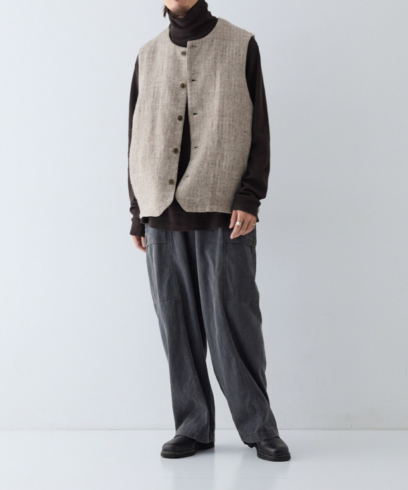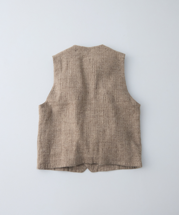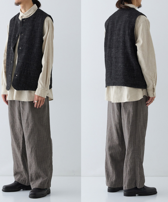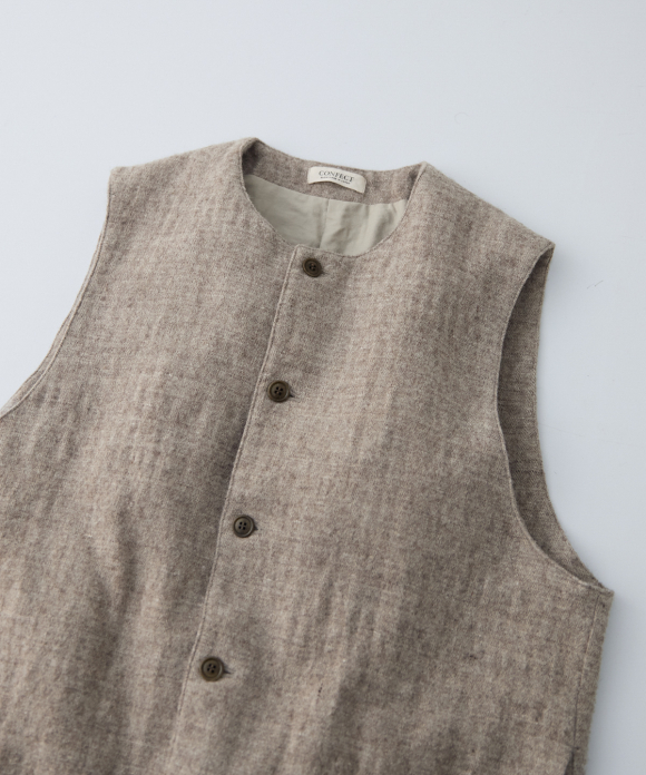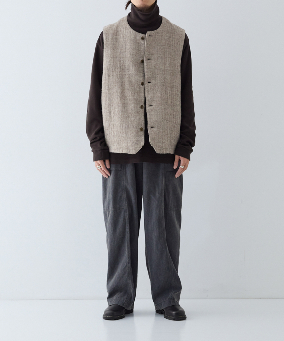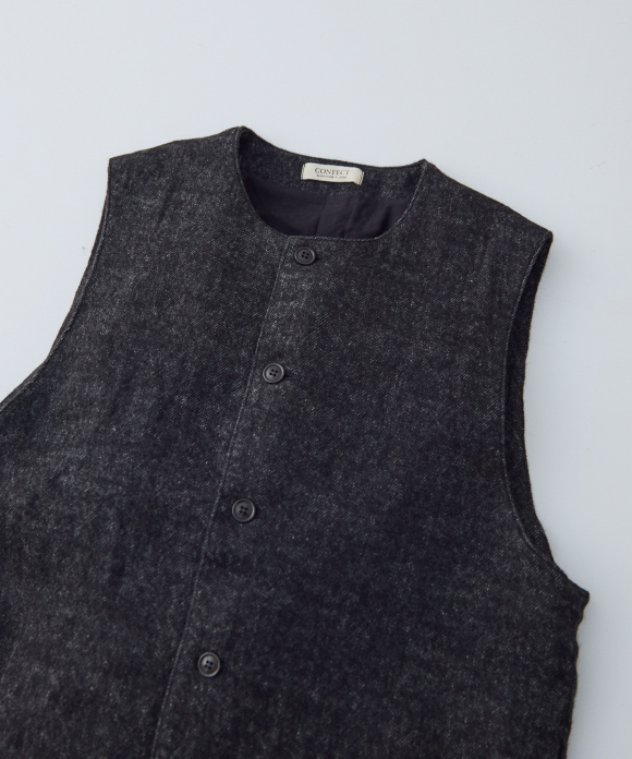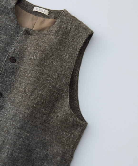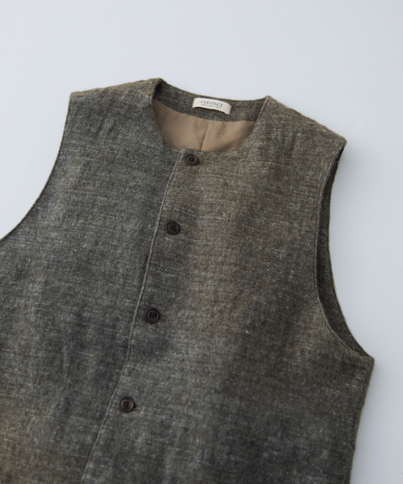A CONFECT's essential crew neck vest featuring a slightly wider, relaxed fit for easy layering. The design includes shifted shoulder seams, adjusted shoulder angles, and lowered armhole bottoms for easy layering with roomy innerwear. A crew neck and simple design maintain versatility, while large nut buttons add a stylish accent. Side seam pockets provide functionality. This twill weave fabric is crafted from linen top yarn sourced from Normandy France, and the weft combines Shetland wool and linen blend yarn. Shetland wool used in this fabric undergoes a combed spinning process for reduced fuzz and soft, smooth finish. With a vintage-inspired aesthetic, the fabric embodies a distinctive CONFECT style, balancing softness and character.
