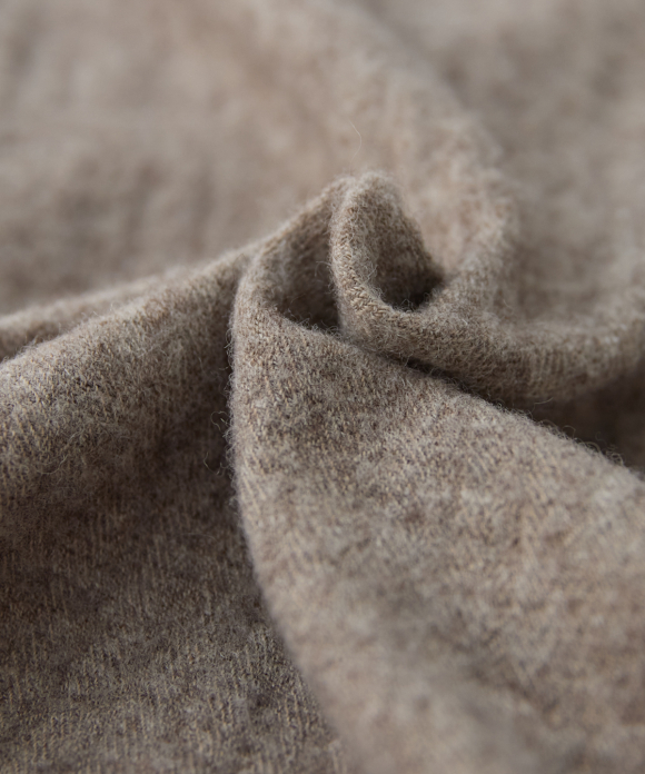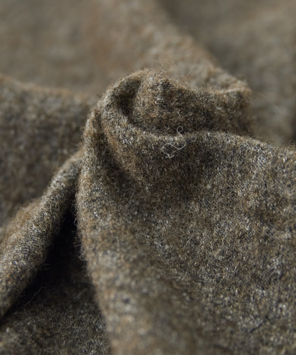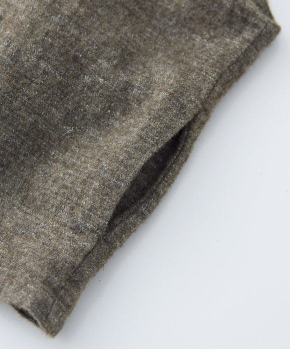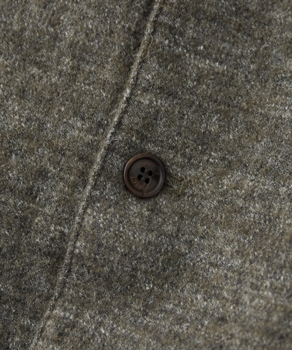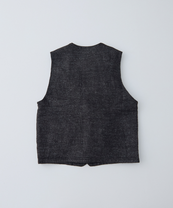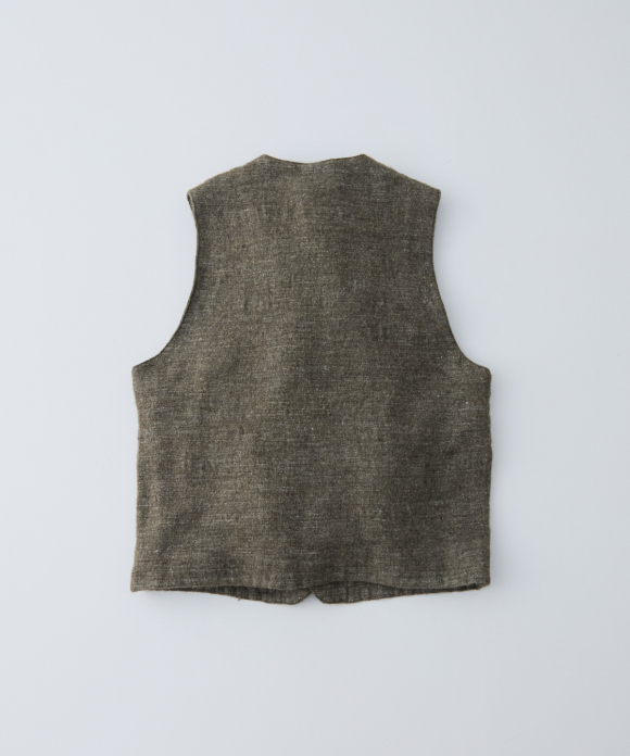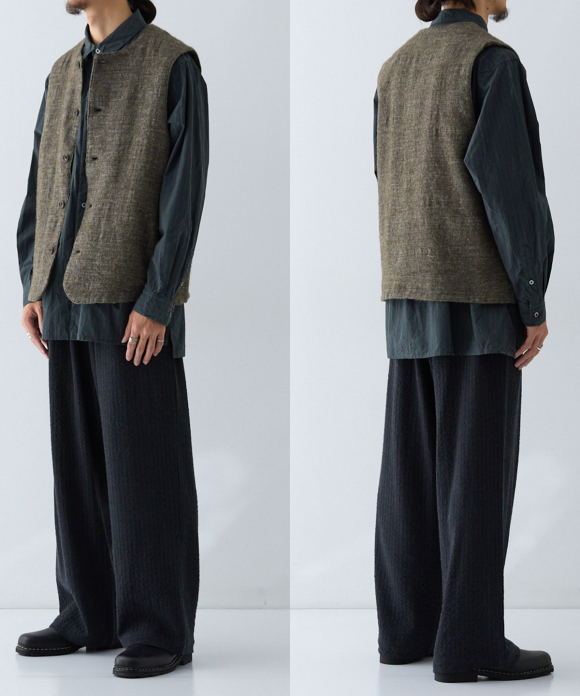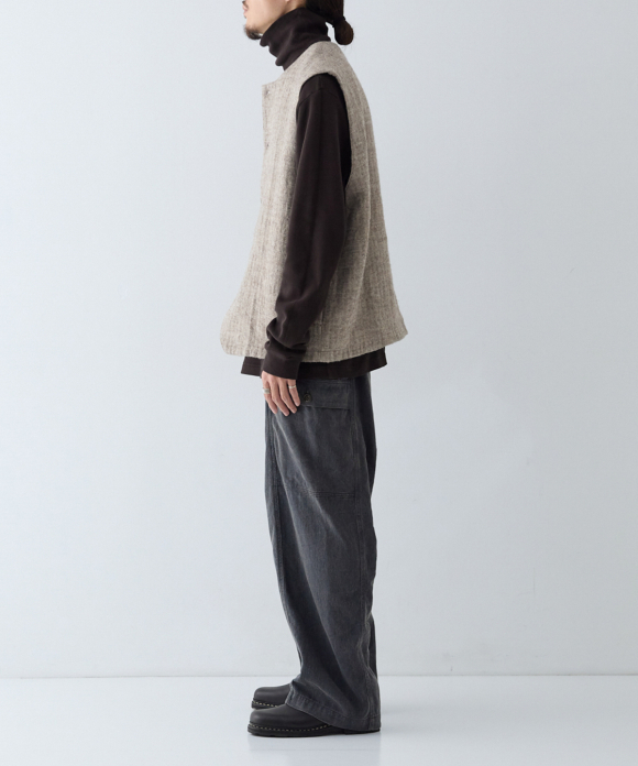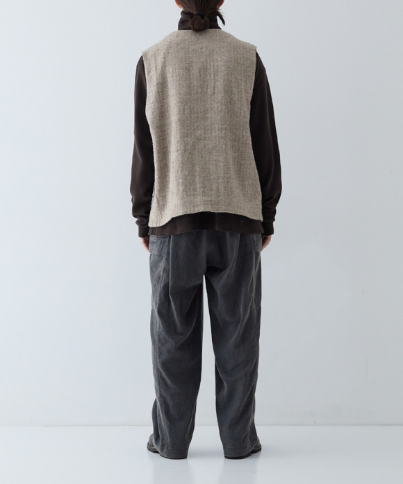 A CONFECT's essential crew neck vest featuring a slightly wider, relaxed fit for easy layering. The design includes shifted shoulder seams, adjusted shoulder angles, and lowered armhole bottoms for easy layering with roomy innerwear. A crew neck and simple design maintain versatility, while large nut buttons add a stylish accent. Side seam pockets provide functionality. This twill weave fabric is crafted from linen top yarn sourced from Normandy France, and the weft combines Shetland wool and linen blend yarn. Shetland wool used in this fabric undergoes a combed spinning process for reduced fuzz and soft, smooth finish. With a vintage-inspired aesthetic, the fabric embodies a distinctive CONFECT style, balancing softness and character.