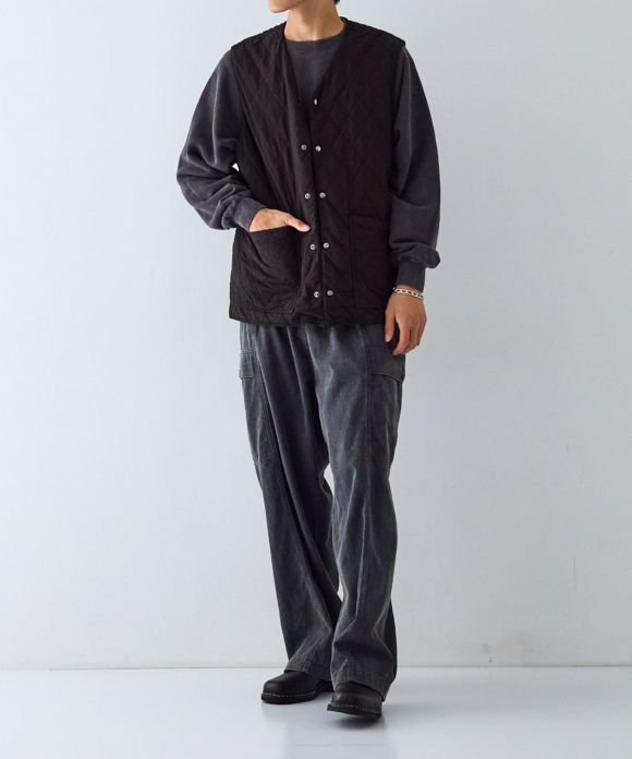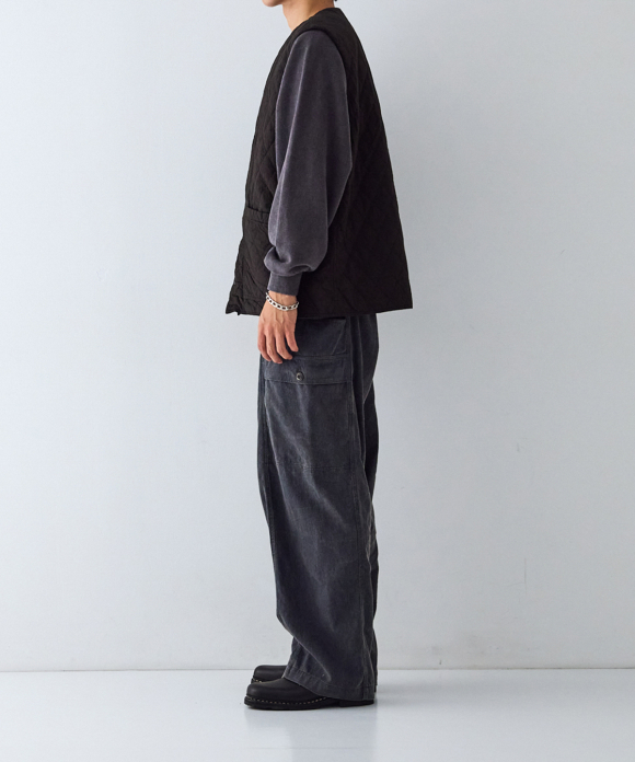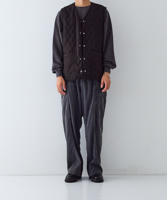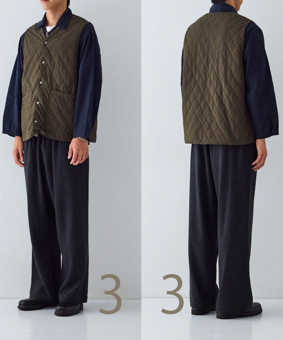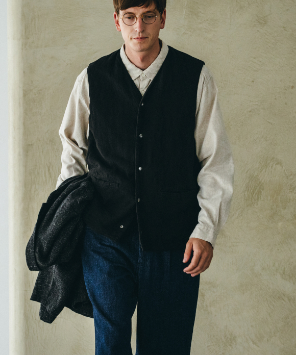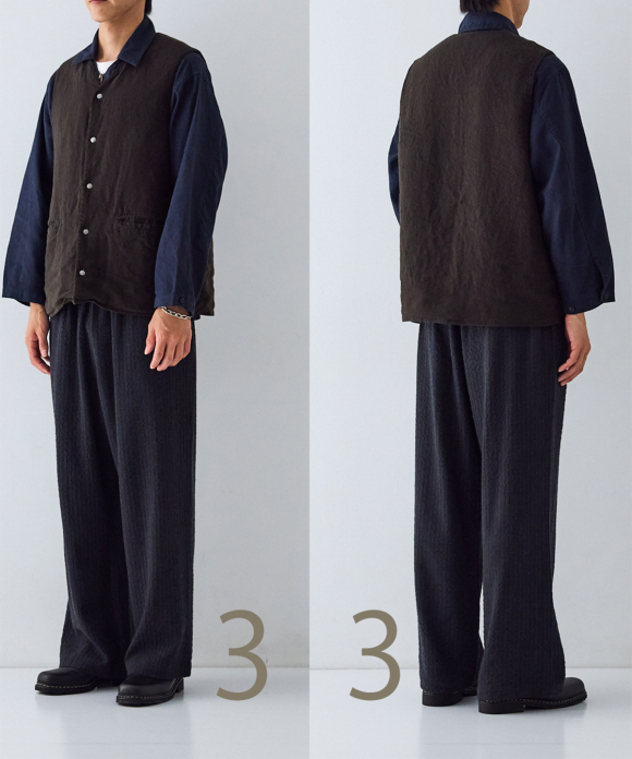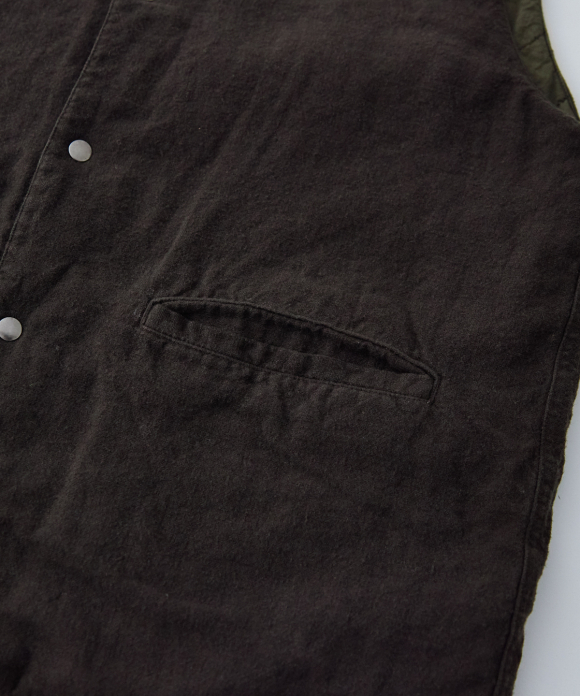 By using double-sided snap buttons, it can be worn comfortably with either side facing out. Not only does the fabric look different, but the front pocket design is also different on the front and back. Product dyeing creates subtle color differences between the fabrics, making it an item you can enjoy matching to the balance of your bottoms and tops.