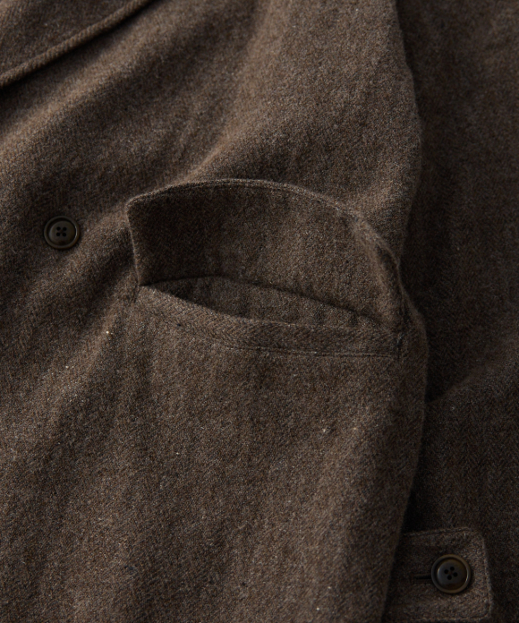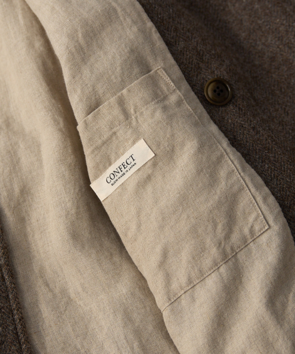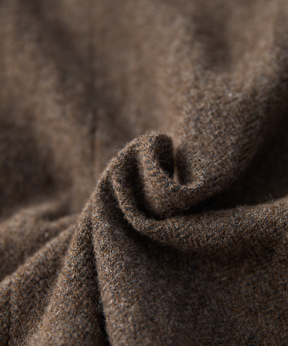 The use of linen for the weft gives the fabric a rough overall impression, while also creating a fabric that is more characteristic of the brand. The wool fabric is also washed, and the density of the weave is calculated to allow pilling to occur during washing.