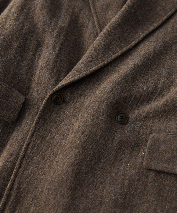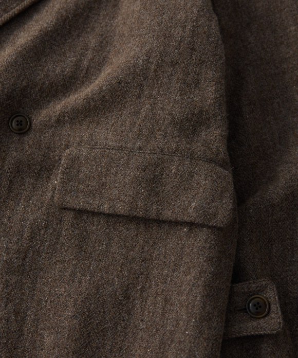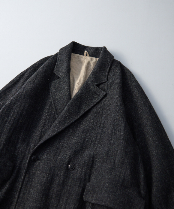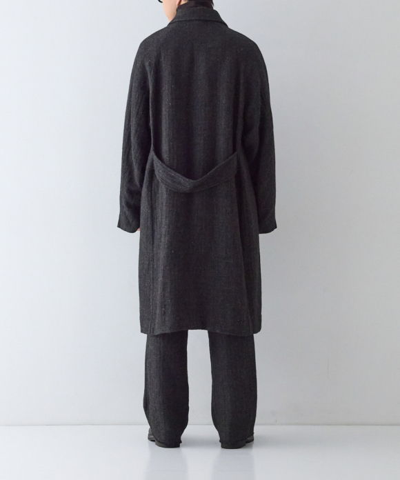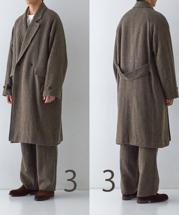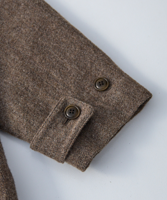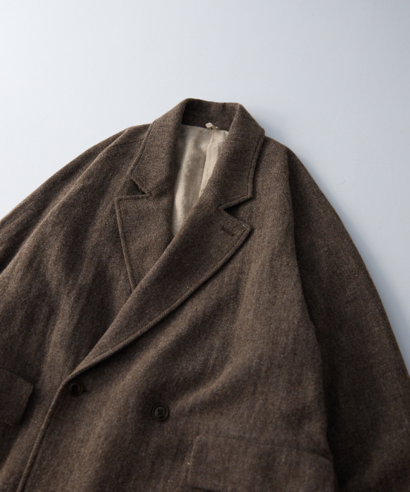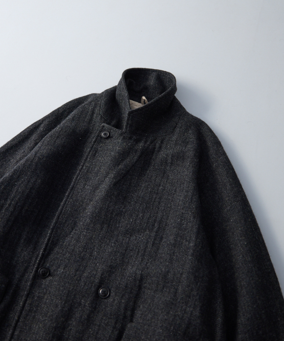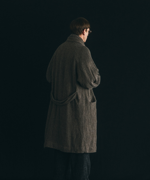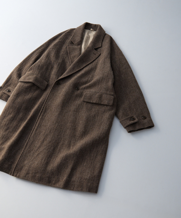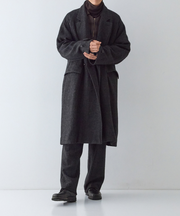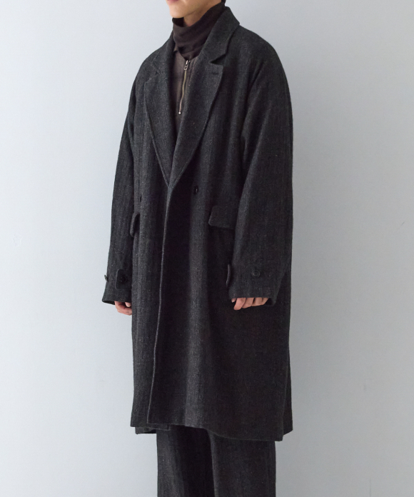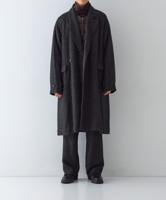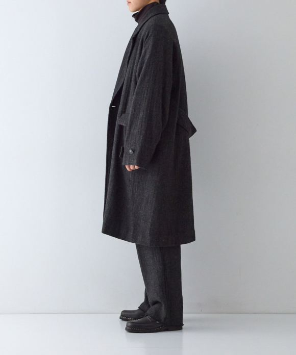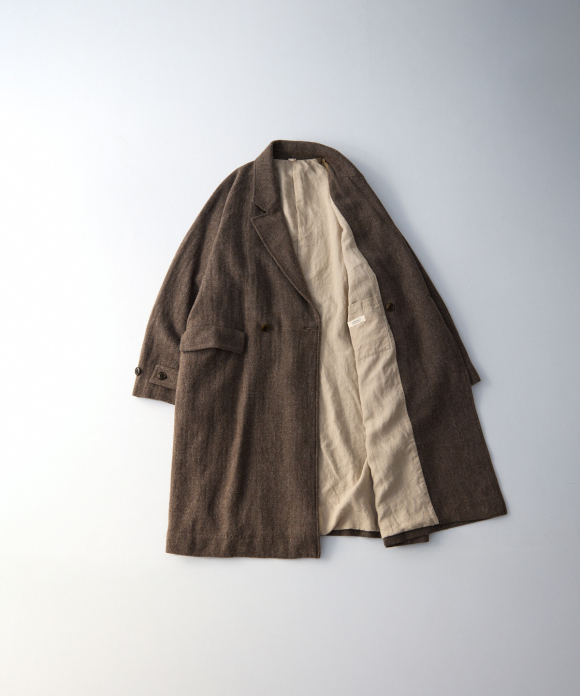 When designing the fabric, we envisioned a coat that exudes a classic atmosphere while maintaining a focus on lightness. Despite its classic appearance, we envisioned a coat that makes full use of the lightweight fabric, resulting in an overcoat with a well-balanced length and width.