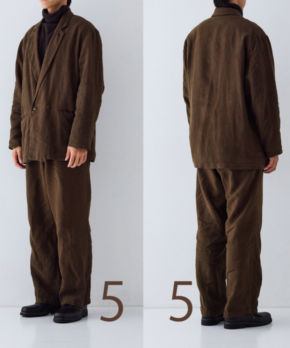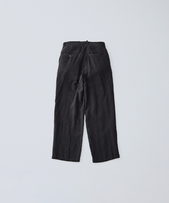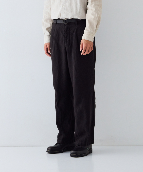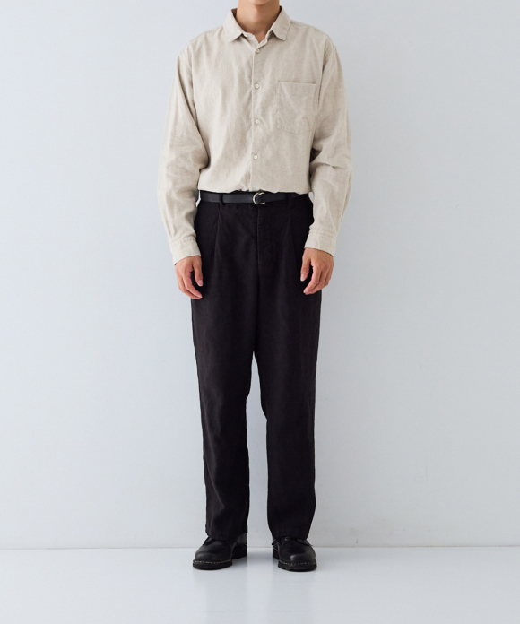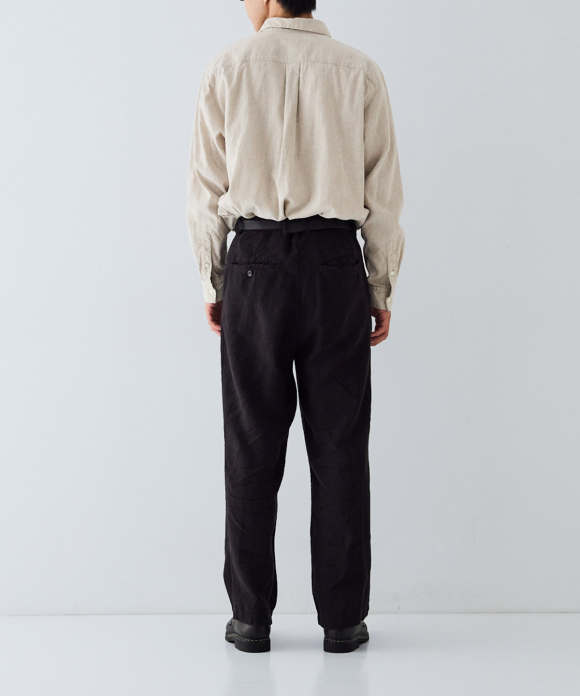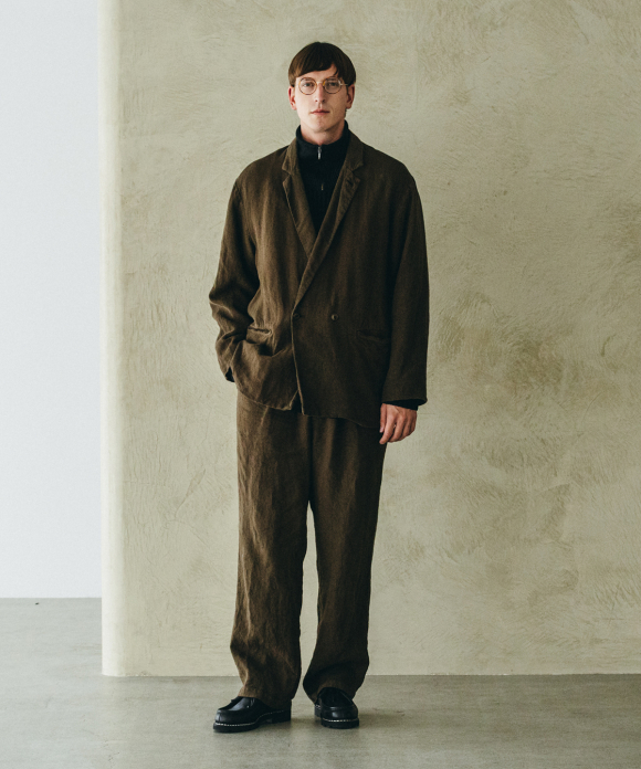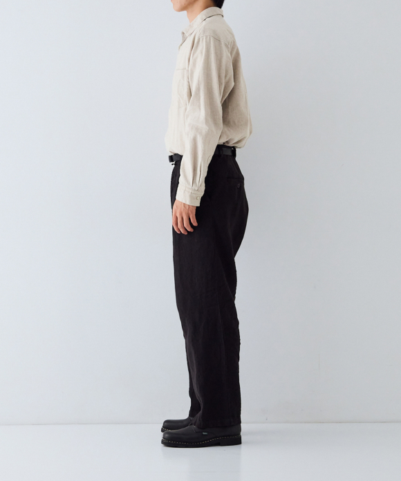 The tapered silhouette, which appears almost straight when worn, maintains CONFECT's signature relaxed silhouette while maintaining a sharp look. Taking into account the natural drape of the linen fabric that develops with repeated wear, the silhouette remains neat even after extended wear.