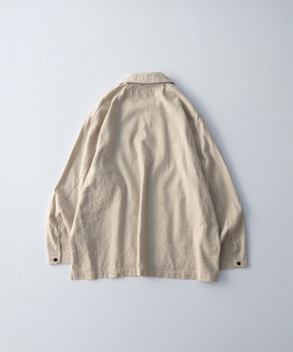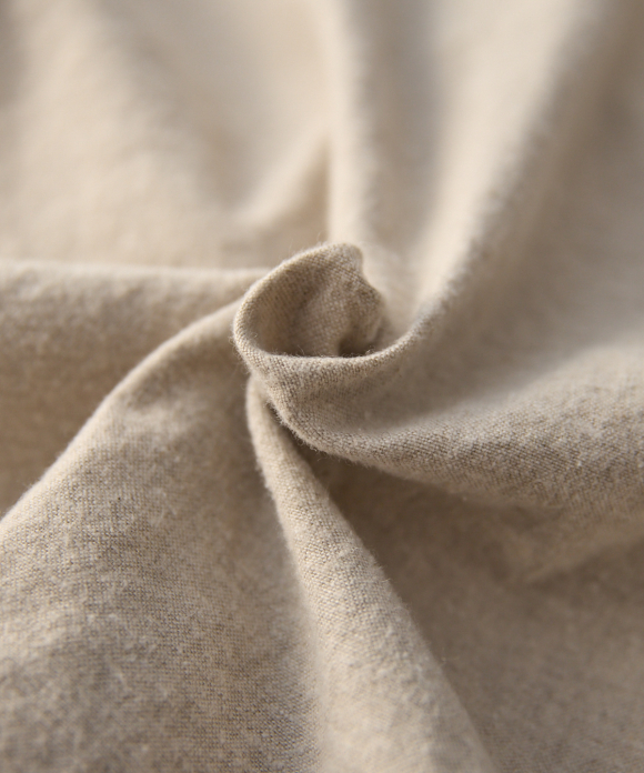 UpcycleLino: This fabric is made from a brushed canvas with a plain weave woven from 25% linen and 9% wool, using recycled linen yarn. This brushed material is made from parts that would otherwise be discarded during the cutting process of clothing production. To reuse these parts as raw material for fabric, the material is passed through a brushing machine and scraped out with countless needles to return it to its cotton state. The brushed linen batting is then blended with organic cotton to create the finished product. The texture changes with washing, and the fabric acquires volume, giving it a compact yet comfortably soft texture. The brushed surface gives it a softer, warmer feel, and the brushed layer creates a material that traps more air and retains heat. Another feature is that when product dyeing is applied, color unevenness occurs not only due to differences in color development and shade caused by differences in materials, but also due to the nap, resulting in a color expression with a greater sense of depth.