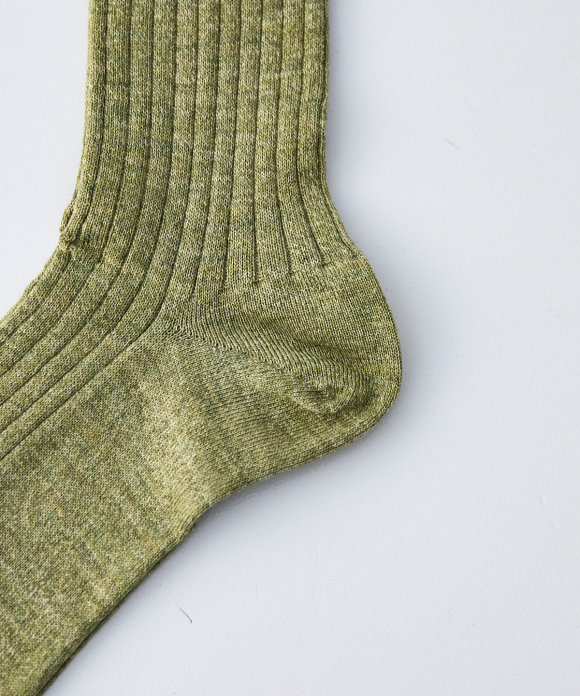 These high-gauge ribbed socks combine warm wool with cool linen to create a unique texture.