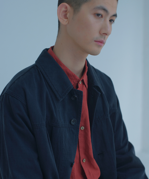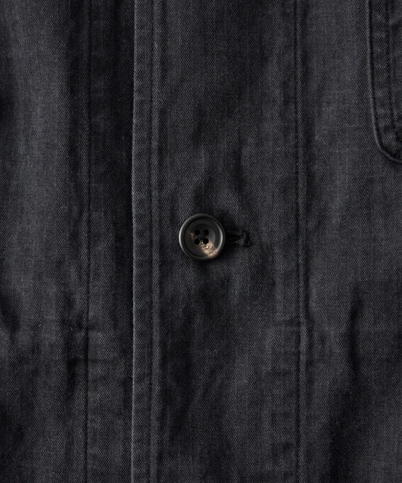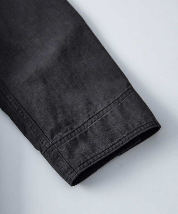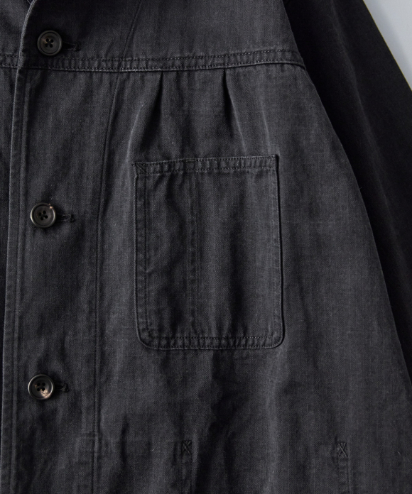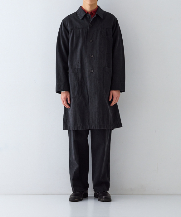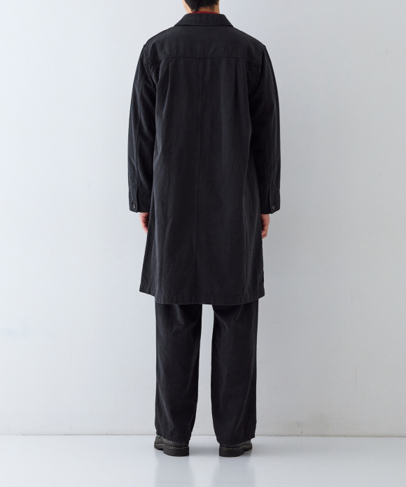 Among CONFECT's coats, this one has a slightly slimmer body width, with the sleeves shaped like shirt sleeves and tucks in the bodice to ensure ample arm movement even while wearing the coat. Large, convenient patch pockets are provided on the outside, and a pocket with fine dividers on the back, characteristic of an atelier coat, is created. The divider stitching is visible on the outside, causing puckering and fading with repeated wear, resulting in the coat's signature look.