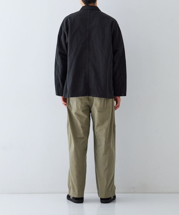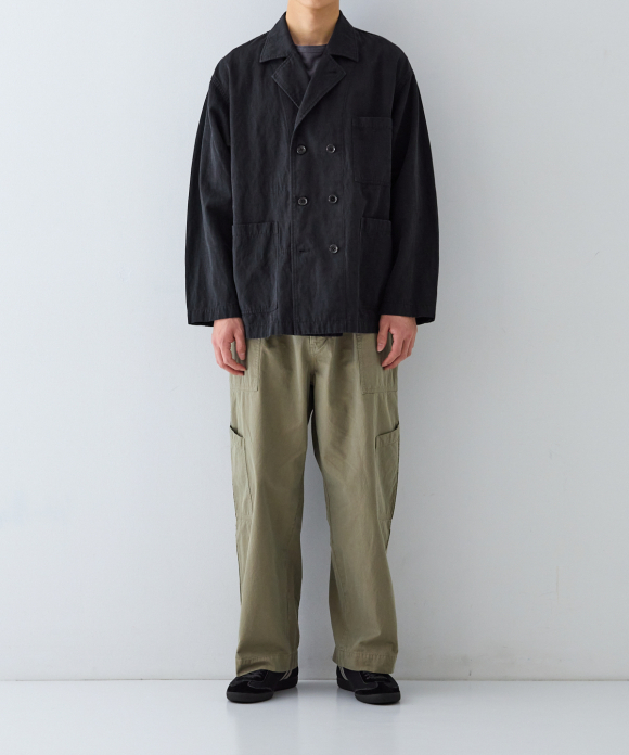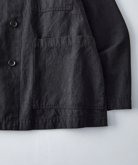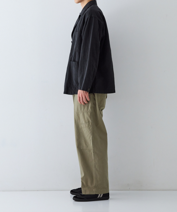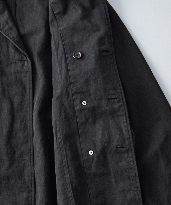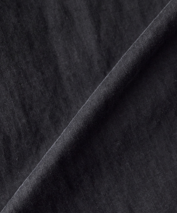 It has a relaxed silhouette with plenty of width, and can be worn buttoned for a more elegant look. However, to fully showcase the texture of the fabric, we recommend leaving it unbuttoned for a more casual look. This will allow you to appreciate the drape of the fabric and the depth and three-dimensionality of the color achieved by the dyeing method, which combines reactive and sulfur dyeing. Intentional puckering creates a unique look.