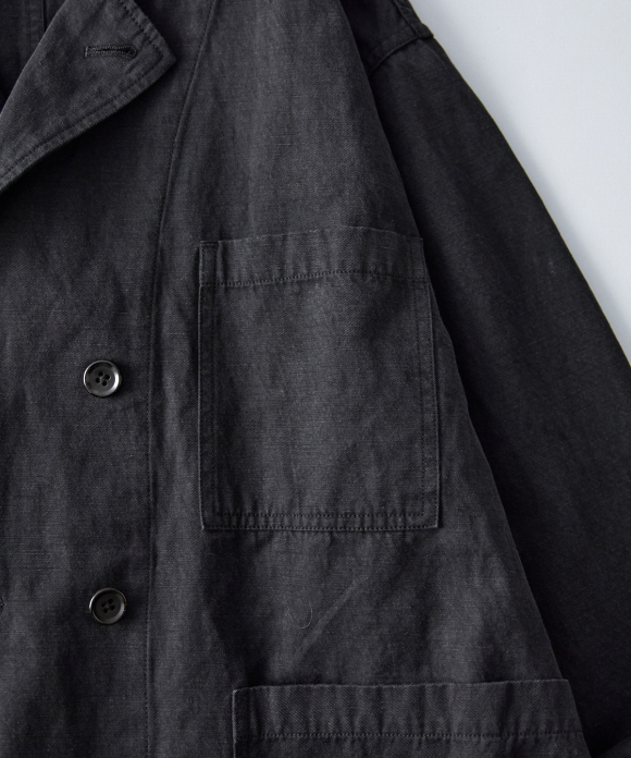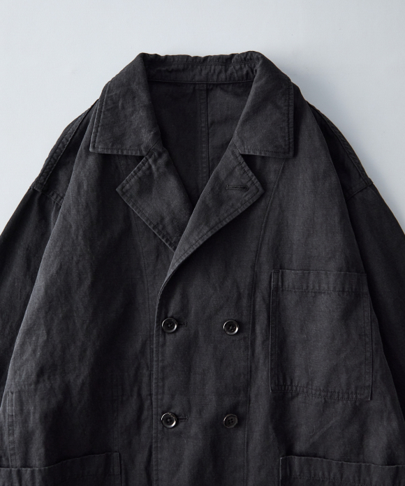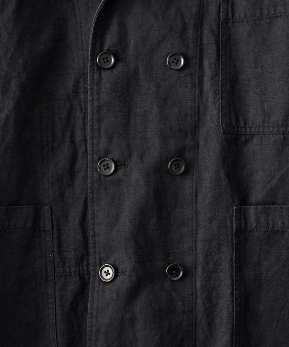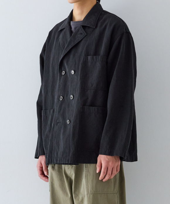 This double-breasted jacket takes advantage of the unique texture and drape and faded feel of the fabric, created by the Nidom process.