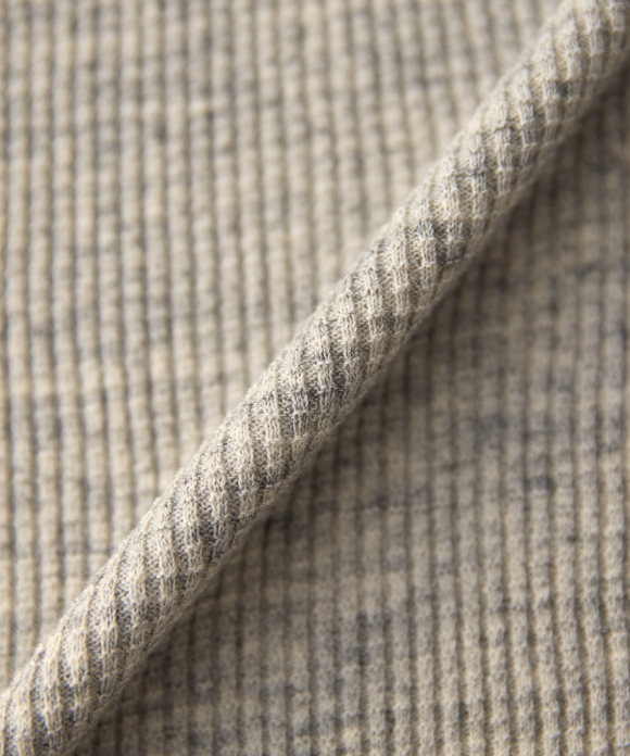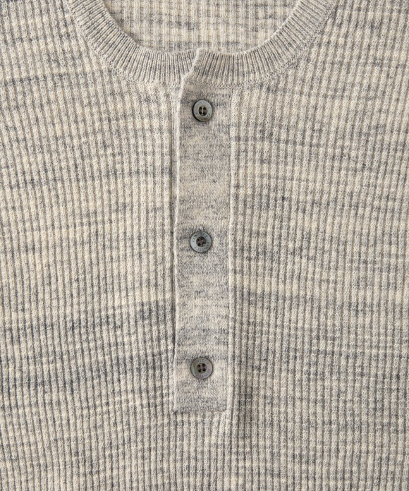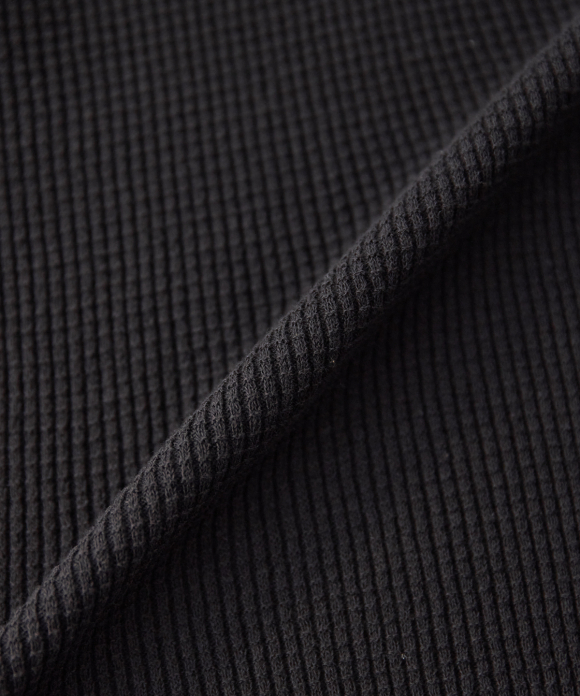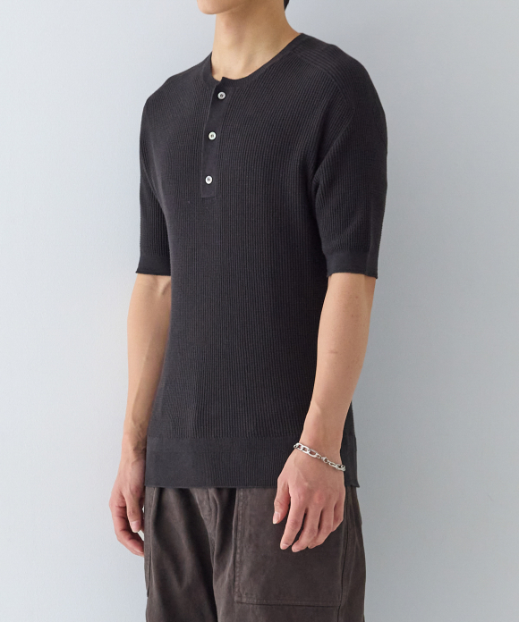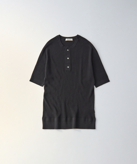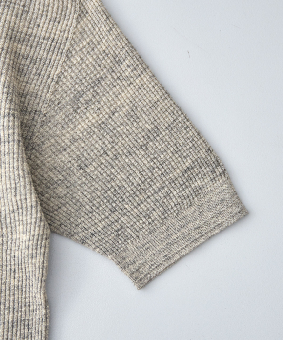This is a waffle knit short-sleeved pullover with a stretchy Henley neck that can also be worn as an inner layer.