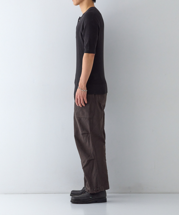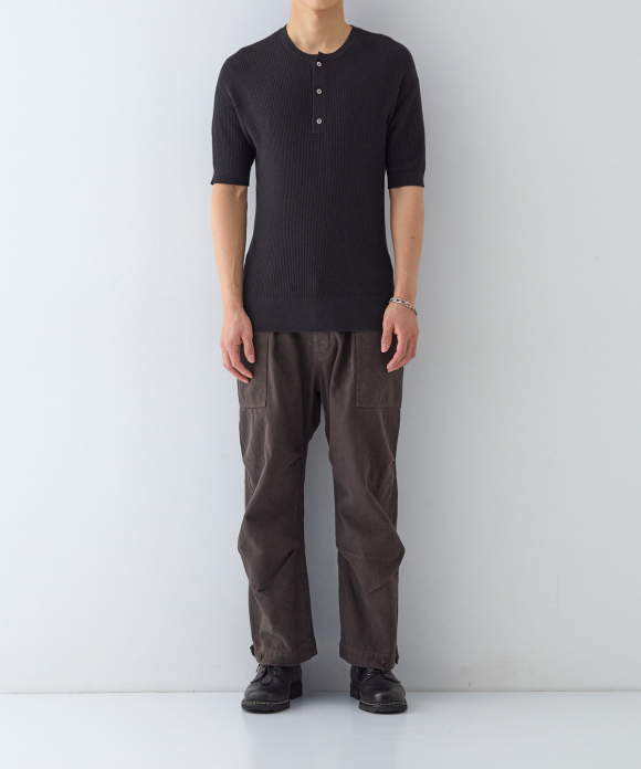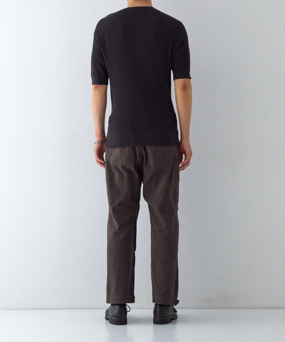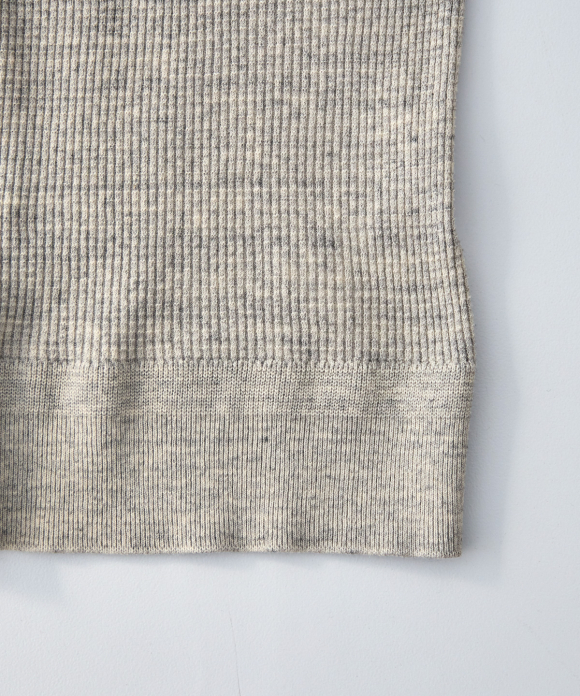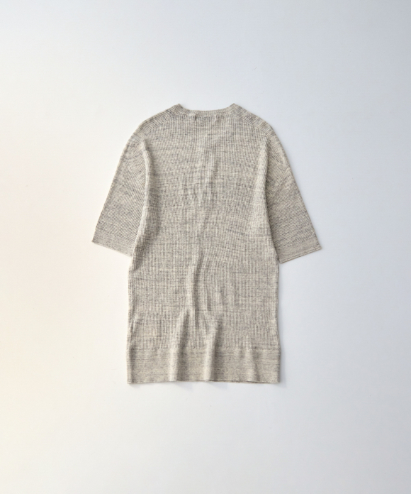 Not only does it benefit from the moisture-absorbing properties unique to cotton, but the twist also creates just the right amount of space in the knit, allowing air to escape and preventing stuffiness. The uneven surface also reduces the area that comes into contact with the skin, maintaining a dry feel and preventing clinging, even in hot weather, creating a linen-like texture.