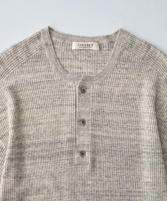 It is also a whole garment knit, with the neck height and opening adjusted to create a neat neckline when worn under a CONFECT shirt.
