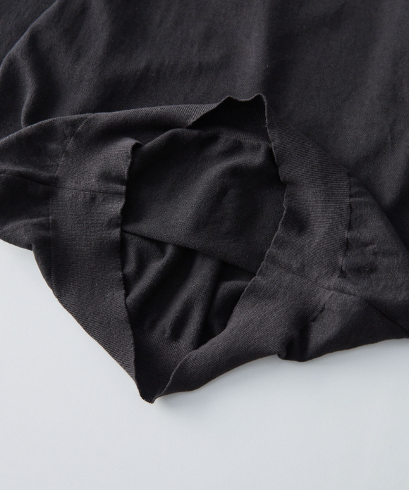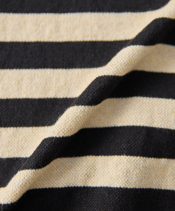 The subtle differences in color and texture resulting from the differences in materials create an atmosphere that cannot be achieved with regular jersey. While it appears to be a simple knit, the combination of linen and bamboo, two particularly distinctive natural fibers, requires highly skilled techniques and takes more time than usual to knit.