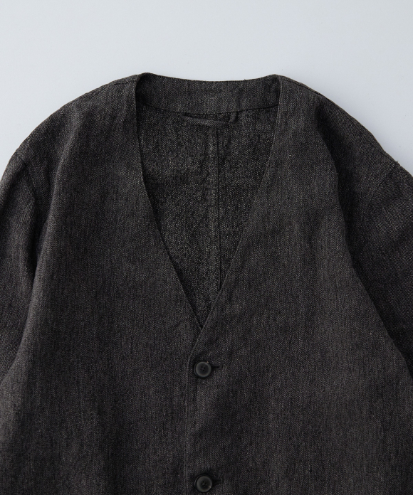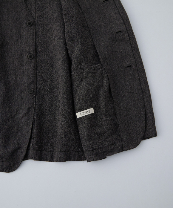 The fabric has a striking texture and appearance, so the collarless, simple design prevents it from looking too heavy as the temperature rises. When the front buttons are fastened, it creates a clean silhouette, while it can also be worn open over a T-shirt for a more casual style.