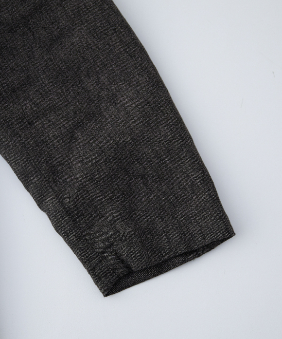 The warp threads are twisted with black and natural threads, and the weft threads are black. This is a thick, heathered fabric. Because the fibers are strong, it maintains its strength even when woven loosely, resulting in a thick yet soft material.